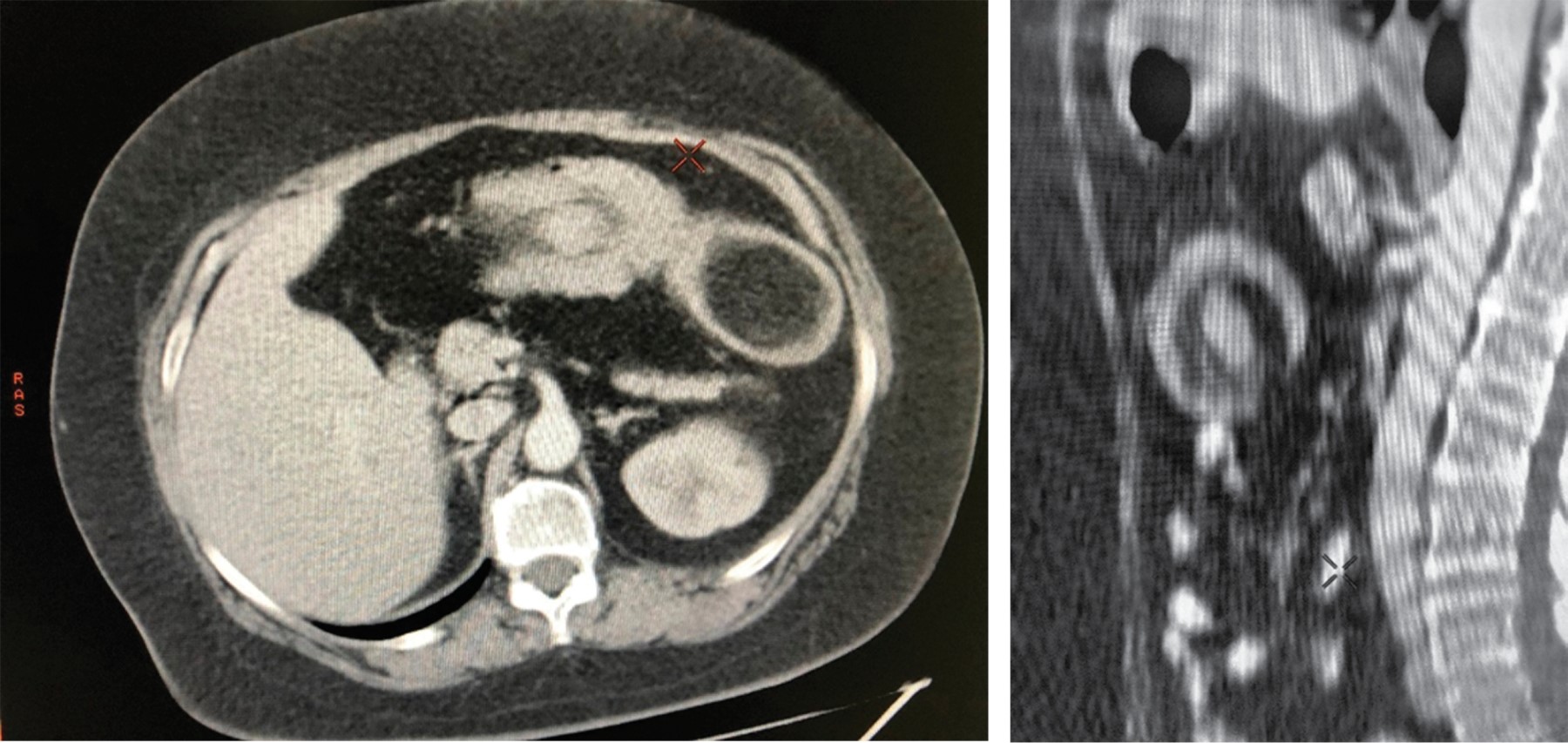 La tomografía de abdomen (con contraste oral e intravenoso [IV]) es el método más sensible (71 al 87%) y específico (cerca del 100%), porque se observa la masa con densidad de grasa (80-120 unidades Hounsfield) y el signo clásico de tiro al blanco o masa en forma de salchicha.10,11 El ultrasonido también nos puede ofrecer datos que orienten el diagnóstico, sin embargo, al ser operador dependiente su sensibilidad y especificidad varía.12