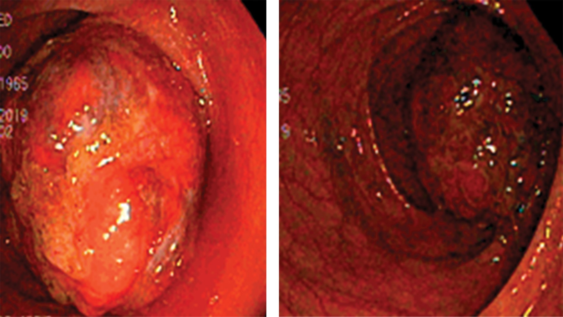 Se realizó colonoscopia donde se observó un tumor polipoide, esférico y de base amplia, ulcerada en su porción visible, que ocluía 80% del lumen intestinal en el segmento de colon transverso (Figura 2), el resto del estudio sin alteraciones. Las biopsias de la lesión se reportaron como tejido inflamatorio y material mucoso.