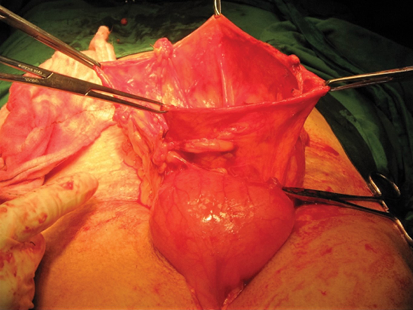 Se realizó laparotomía y se encontró quiste multiloculado de 15 × 8 cm localizado en el omento mayor (Figura 1), el cual se resecó en su totalidad sin complicaciones (Figuras 2 y 3).