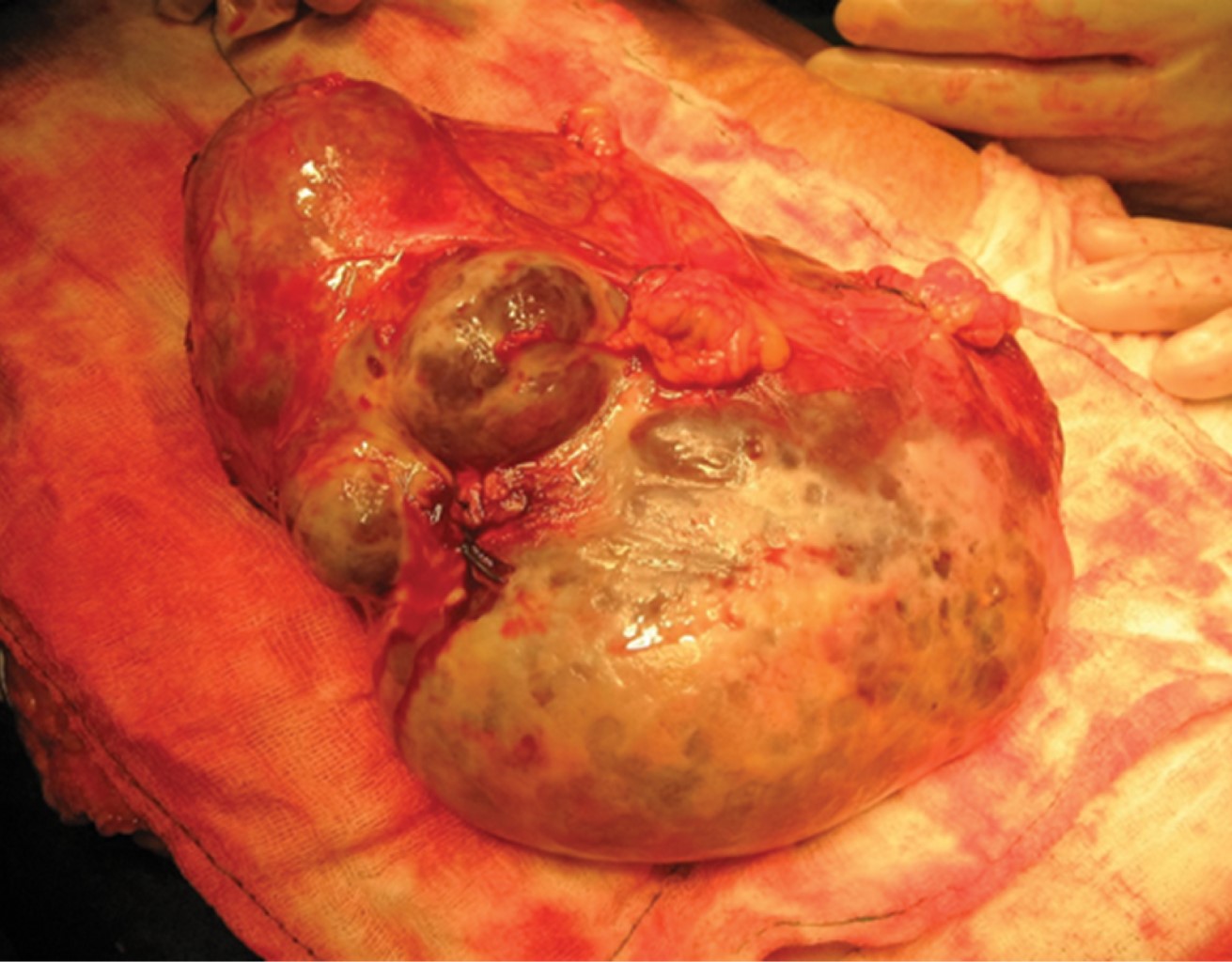 Se presenta el caso de una mujer de 49 años de edad con antecedentes de aumento en el volumen intraabdominal con crecimiento lento y progresivo. A la exploración física se identifica una masa de aproximadamente 16 cm, superficie lisa, bordes definidos, consistencia dura, no protruyó con la maniobra de Valsalva, no late ni se expande, no dolorosa, móvil en todas las direcciones, localizada en epigastrio y mesogastrio. Se realizó ultrasonido abdominal que demuestra una masa quística intraabdominal con tabiques en su interior que midió aproximadamente 155 mm, localizada en epigastrio y mesogastrio, la cual se corrobora por tomografía abdominal contrastada.