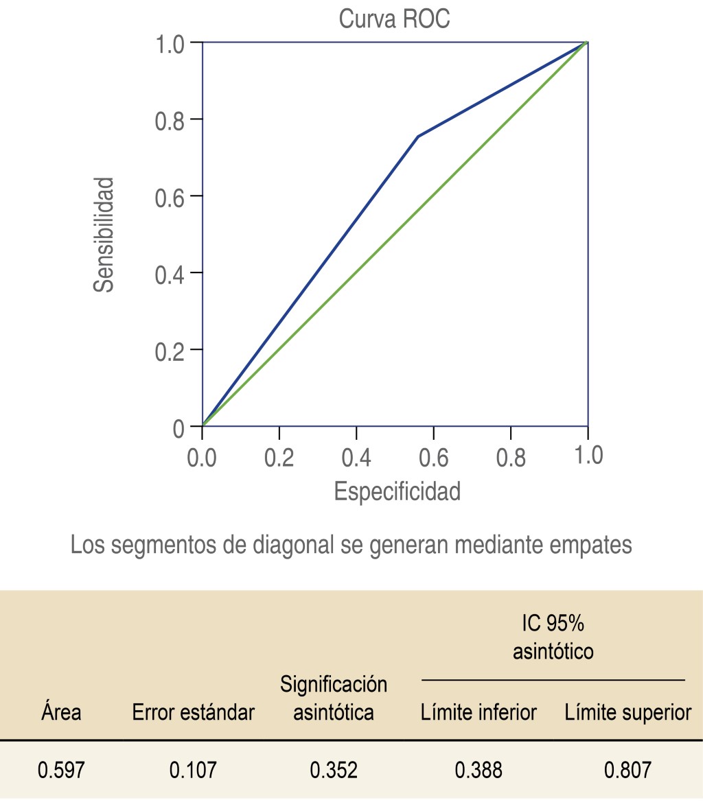 Al trazar los verdaderos positivos (sensibilidad) y los verdaderos negativos (1-especificidad) en el punto de corte, se desarrolló la curva ROC, de modo que el área bajo la curva determinó la discriminación del modelo, es decir, su capacidad para diferenciar a aquellos pacientes que se predijo presentarían complicaciones graves y/o muerte perioperatoria, de aquellos que no. En las Figuras 1 y 2 se observan las curvas ROC establecidas para determinar la fragilidad mediante dinamometría en los pacientes estudiados. Es importante señalar que el área bajo la curva para las complicaciones (0.625) y para la muerte (0.597) evidenció una aceptable capacidad predictiva.