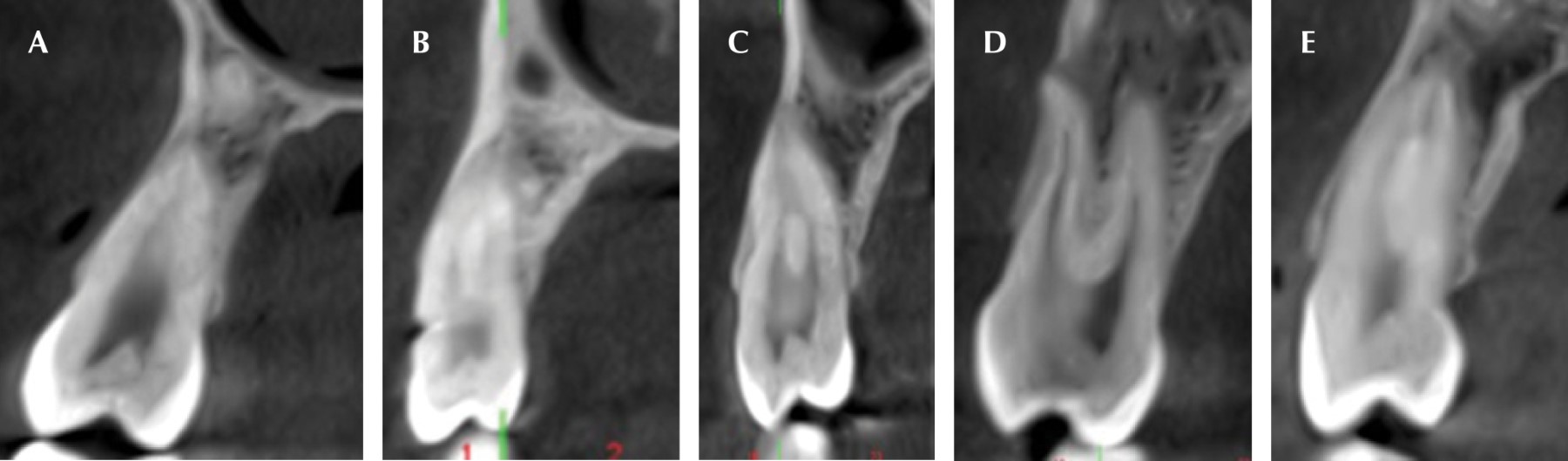 En diversos estudios se ha recalcado lo esencial de la CBCT con alta resolución en la identificación inicial de la morfología interna de las piezas dentarias, por ejemplo, el caso del hallazgo de un cuarto conducto en los primeros molares superiores o el tercer conducto en la raíz mesial del primer molar inferior.7,8 También, en la detección de lesiones periapicales que en la radiología convencional 2D serían imposibles de diagnosticar, debido a la anatomía de la lesión, como sucede en ocasiones en los ápices de los molares superiores por la estrecha proximidad con el piso del seno maxilar o cuando el espesor óseo entre la lesión y el piso del seno es menor a un milímetro.9