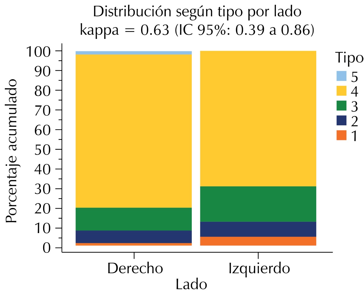 Coincidencia de tipos entre lados derecho e izquierdo: la coincidencia de tipos entre los lados derecho e izquierdo fue significativa y buena (Figura 3): kappa = 0.63 (IC 95%: 0.39 a 0.86%); z = 6.49; p < 0.05.