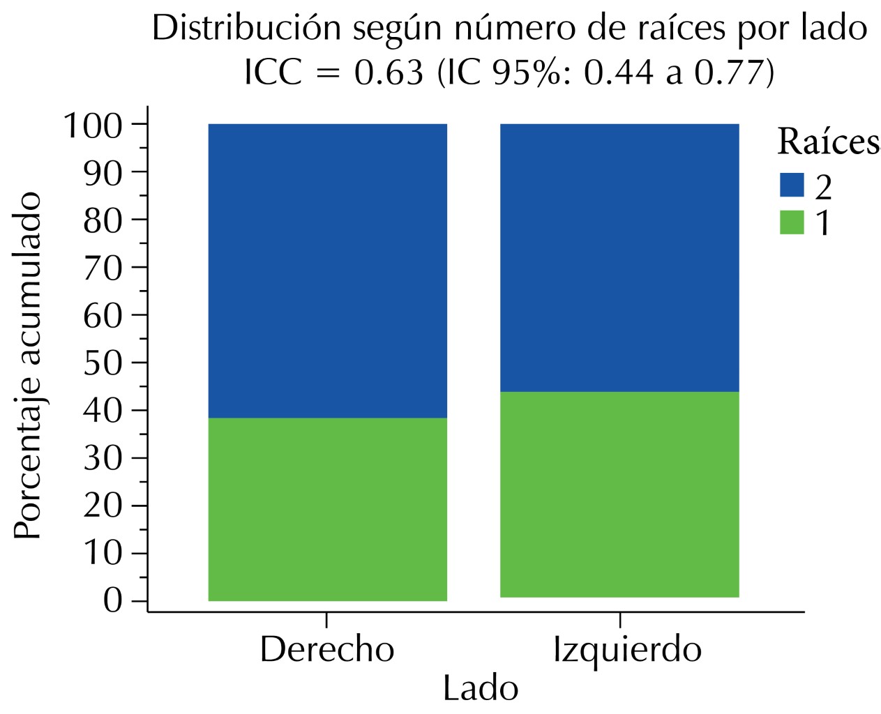 Coincidencia del número de raíces entre lados derecho e izquierdo: la coincidencia del número de raíces entre los lados derecho e izquierdo fue significativa y buena (Figura 4): ICC = 0.63 (IC 95%: 0.44 a 0.77%); F = 4.46; p < 0.05.