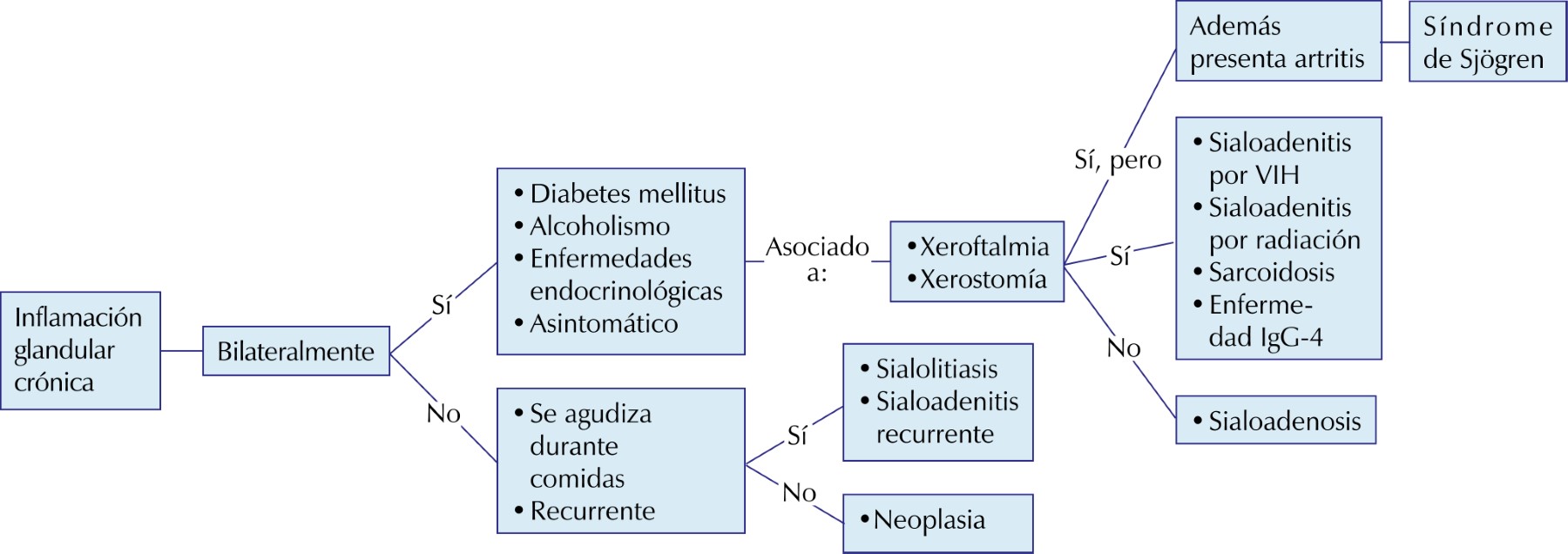 Entre los exámenes de laboratorio en el protocolo de estudio en la patología de glándulas salivales, encontramos anticuerpos SS-A o SS-B cuando se sospecha de síndrome de Sjögren, o bien, cuando se sospecha de un proceso infeccioso contamos con estudios como recuento leucocitario y proteína C reactiva.4 Las alteraciones inflamatorias y obstructivas se observan con más frecuencia en las glándulas salivales mayores. Estas condiciones pueden simplificarse en dos características; la primera incluye enfermedades que alteran el tejido glandular, mientras que la segunda se encuentra principalmente en el sistema excretorio. Un ejemplo de la primera es el infiltrado intersticial observado en las infecciones agudas de origen viral; mientras que en la segunda en el sistema excretorio se trata de obstrucciones en los conductos que conducen por lo regular a una sialoadenitis.5