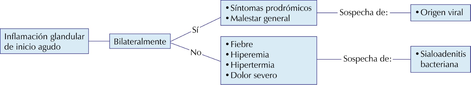 Una sialoadenitis de origen viral, a diferencia de la sialoadenitis de origen bacteriano, presentará de tres a cinco días síntomas prodrómicos no específicos como fiebre, malestar general, dolor de cabeza, mialgias, artralgias y anorexia. En 75% de los casos la inflamación parotídea se presentará de manera bilateral. Aunque los síntomas inicien de manera unilateral con el tiempo se convertirán en bilateral y por lo regular sin datos de hipertermia ni eritema. En las infecciones virales se dan principalmente de manera hematógena, aunque también pueden aparecer infecciones virales que hayan llegado de manera retrógrada a través del conducto de la glándula salival, tal es el caso de parotiditis (paperas), el cual es causado por el virus Paramyxovirus. Su tratamiento es de apoyo y consistirá en hidratación, higiene oral y reposo, ya que casi siempre son autolimitantes y desaparecerán por sí mismos. El uso de antipiréticos, antiinflamatorios y analgésicos resulta benéfico para el paciente. Su resolución se da por lo regular entre cinco y 10 días.2,4