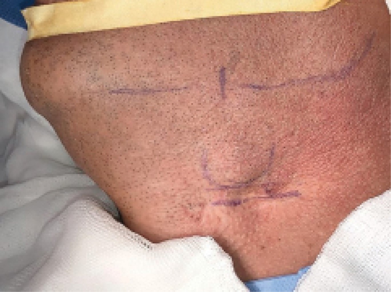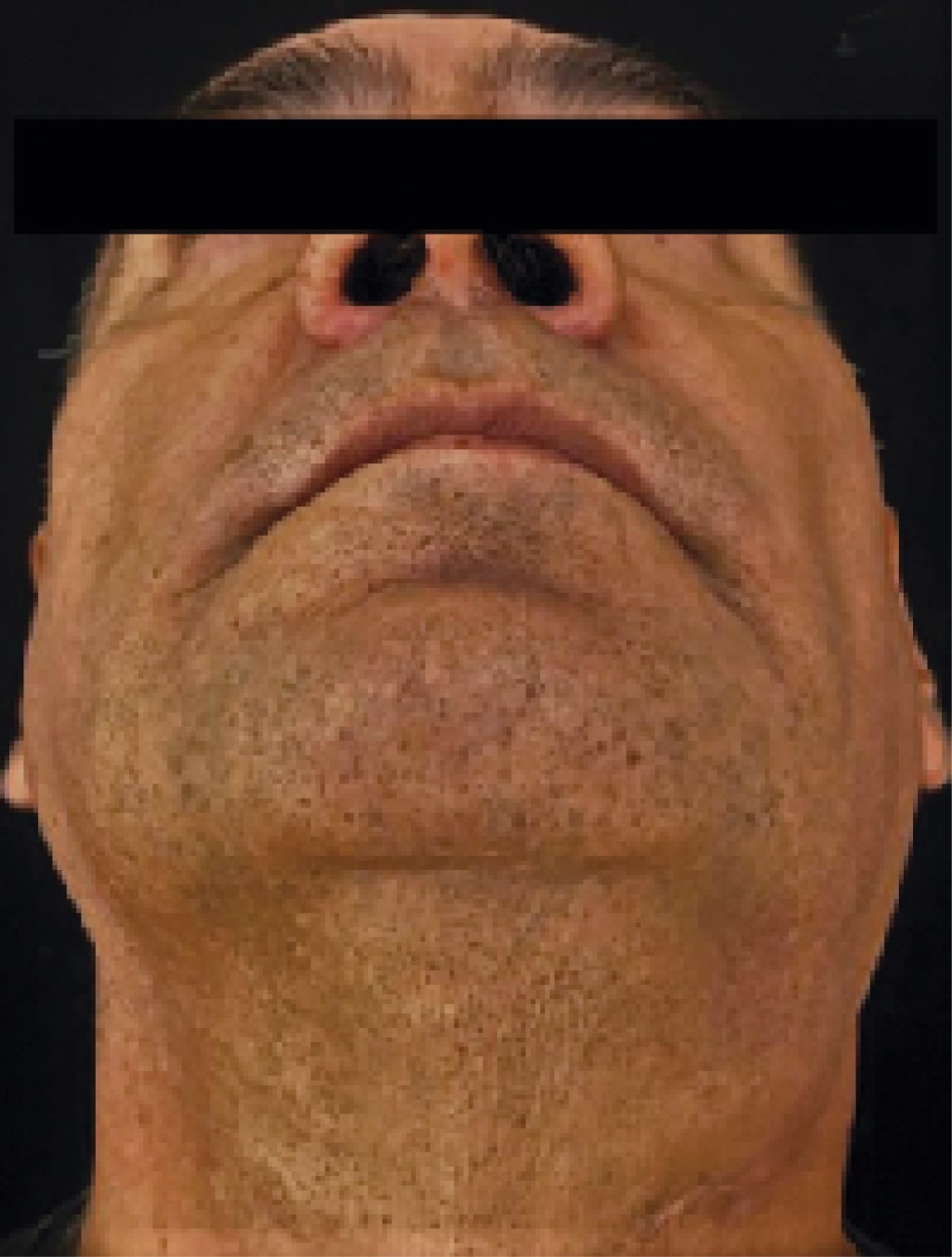 Presentamos el caso de paciente masculino de 57 años de edad, el cual refiere inicio de padecimiento actual en enero de 2019 con datos de aumento de volumen en región submandibular izquierdo (Figura 3) presentándose de manera intermitente, agudizando durante la alimentación, con antecedente de fistulización espontánea con gasto de secreción purulenta bajo tratamiento antibiótico. A la exploración física se encuentra aumento de volumen en región submandibular izquierda, de consistencia firme, móvil, no doloroso a la palpación, con tegumentos de color similar a tejido adyacente. Intraoralmente encontramos fórmula dental incompleta con datos de mala higiene oral, con datos de disminución de flujo salival de conducto submandibular izquierdo, mucosas subhidratadas. Se solicitó TC simple de macizo facial y cuello, donde se observa lesión hiperdensa con respecto a tejidos adyacentes en región submandibular, así como aumento de volumen de glándula submandibular del lado izquierdo (Figura 4). Correlacionando los datos clínicos y estudios de imagen se da un diagnóstico presuntivo de sialoadenitis y sialolitiasis de glándula submandibular izquierda (Figura 5). Dentro de antecedentes patológicos y no patológicos encontramos paciente con hipertensión arterial sistémica bajo tratamiento médico con losartán de 50 mg cada 12 horas, fumador desde los 20 años, hasta una cajetilla de cigarros al día, alcoholismo desde los 20 años de forma frecuente.