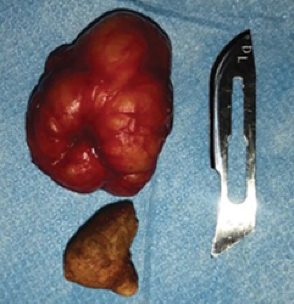 Según se reporta, el tratamiento indicado para la sialoadenitis crónica y recurrente es la sialoadenectomía debido a que en esta condición la glándula deja de ser funcional y tiende a sufrir infecciones agudas de manera persistente.10 Existen otras alternativas como la técnica láser, esta técnica permite la remoción de los cálculos sin necesidad de resección glandular.11 Algunos autores mencionan que el tratamiento conservador para la sialolitiasis es efectivo para los sialolitos menores de 1.5 cm.12 Por lo anterior, en el caso presentado se optó por hacer exéresis de la glándula submandibular debido al tamaño del sialolito y al antecedente de sialoadenitis supurativa recurrente.