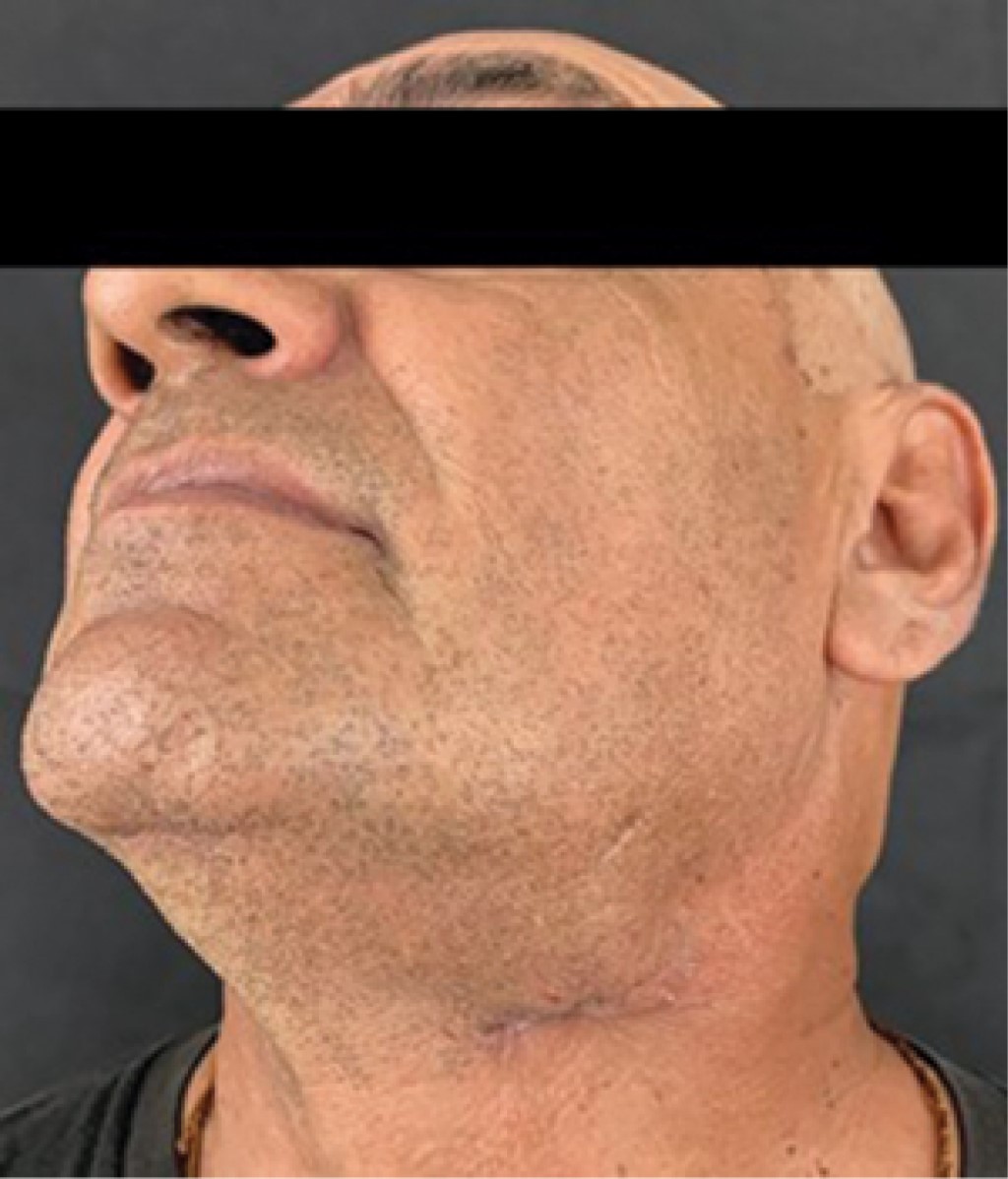 Se decide realizar tratamiento quirúrgico de biopsia escisional de glándula submandibular izquierda (Figura 6) así como de probable sialolito encontrado en conducto de la glándula asociada (Figura 7), ambos especímenes fueron enviados para su estudio histopatológico, confirmando los diagnósticos de sialolitiasis, sialoadenitis y además se obtuvieron datos histológicos compatibles con sialoadenosis. Actualmente a sus 12 meses postoperatorios el paciente evoluciona de manera favorable sin datos de recidiva (Figura 8).