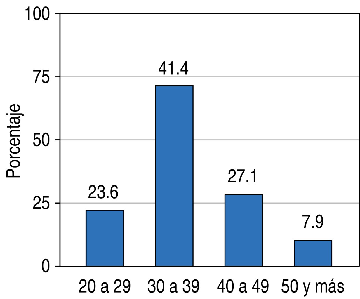 De un total de 400 pacientes, se obtuvo una tasa de respuesta de 50.7% (n = 203), con participación mediante consentimiento verbal, 49.3% no fue localizable dentro de los números registrados. Se analizaron 203 mujeres, con una edad promedio de 36.3 ± 8.7 años, con un rango entre 20 y 77 años. En la Figura 1 se muestra la distribución por decenios de edad, donde se observa que el grupo de mayor frecuencia fue el de 30 a 39 años con 41.4% de los casos. Posteriormente se dividieron por submuestras generacionales, donde 65% (n = 132) tenía menos de 40 años y 35% (n = 71) 40 y más años, a las que se les aplicó la encuesta propuesta (Tabla 1).