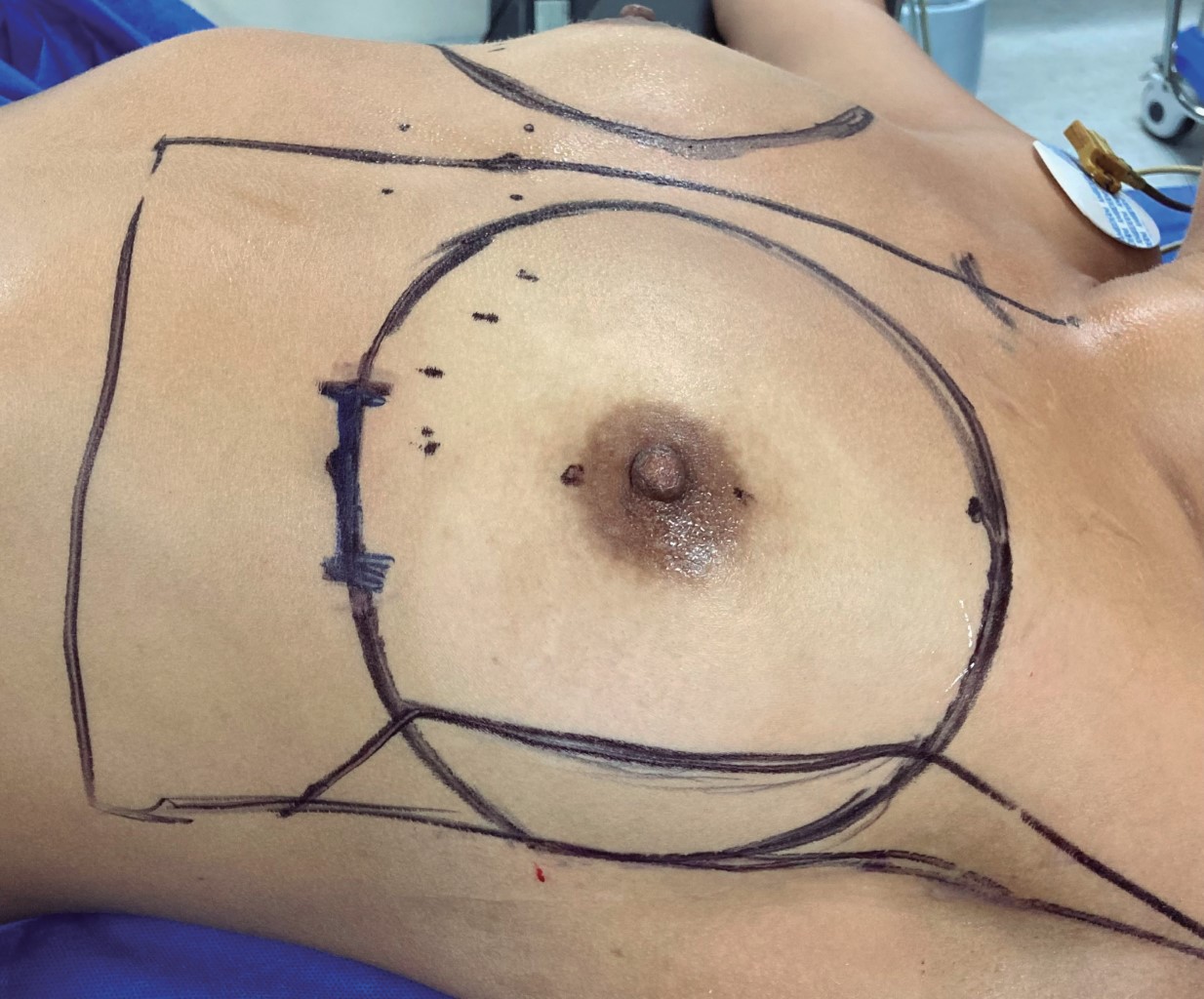 El aumento de mama con implantes se mantiene hoy día como el procedimiento quirúrgico estético más realizado en todo el mundo. De acuerdo con lo publicado en The International Survey on Aesthetic/Cosmetic Procedures de la International Society of Aesthetic Plastic Surgery (ISAPS), sólo en el año 2020 se registraron 1'624,281 cirugías de aumento de mama con implantes, que corresponde a 16% del total de los procedimientos, sólo seguido de cerca por la liposucción y con menor frecuencia la cirugía de párpados, rinoplastia y abdominoplastia.1 El tamaño de la incisión dependerá del acceso quirúrgico, pero en general debe ser lo más pequeño posible y lo suficientemente grande como para realizar la disección del bolsillo y colocar el implante sin distorsión o daño al dispositivo.2 Hemos notado que al tratar de introducir implantes mayores de 350 mL con gel cohesivo y recubiertos de micropoliuretano, existe mayor riesgo de daño por presión y fricción en los bordes de la herida, así como en la integridad del gel del implante, lo que invariablemente nos obliga a retirar el tejido dañado, al tener como resultado una herida final incluso de mayores dimensiones que la planeada. Para el cirujano plástico la incisión ideal para la colocación de implantes mamarios es (Figura 1):