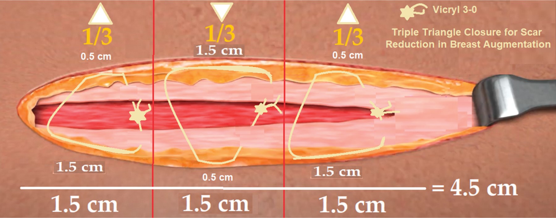 El tamaño de la incisión final en el aumento mamario con implantes es un factor importante para el grado de satisfacción de la paciente; por lo tanto, la incisión debe ser lo más pequeña posible, pero lo suficientemente grande para realizar la disección del bolsillo completo y exacto, hemostasia prospectiva, lavado de restos tisulares y permitir colocar el implante sin producir daño a los bordes de la herida o distorsión del dispositivo. En la búsqueda del equilibrio entre ambas demandas proponemos una técnica sencilla, reproducible y segura para el cierre de la incisión submamaria con reclutamiento de tejido mediante la colocación de puntos triples triangulares que permite de manera constante la reducción de la longitud total de la herida en al menos 1 cm, lo cual permitirá al cirujano acercarse más a la solicitud de incisiones pequeñas sin sacrificar la disección exacta, hemostasia, lavado, integridad del implante y seguridad en el cierre de la herida.INTRODUCCIóN