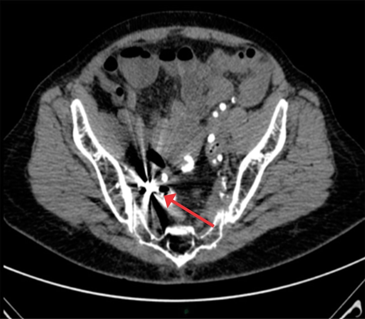 Los exámenes de laboratorio mostraron anemia normocítica normocrómica. Se realizó endoscopia y colonoscopia sin lograr encontrar una fuente clara del sangrado. Como parte de la evaluación del probable sangrado de intestino delgado, se realizó una videoendoscopia con cápsula. La CE reportó úlceras intestinales circunferenciales que causaron un sitio de estenosis donde se retuvo la cápsula. Dos semanas posteriores a la ingestión de la cápsula la paciente se presentó al Servicio de Urgencias con datos de oclusión intestinal y abdomen agudo. Los exámenes de laboratorio mostraron leucocitosis 11.1 × 103/L (4.8-11.0 × 103/L), hemoglobina de 10.2 g/dL (13.5-15.5 g/dL), así como una proteína C reactiva de 19.6 mg/dL (0.00-0.50 mg/dL). Se realizó una TAC abdominal que mostró la CE cerca del íleon terminal, además de engrosamiento ileal y de pared vesical (Figura 1).