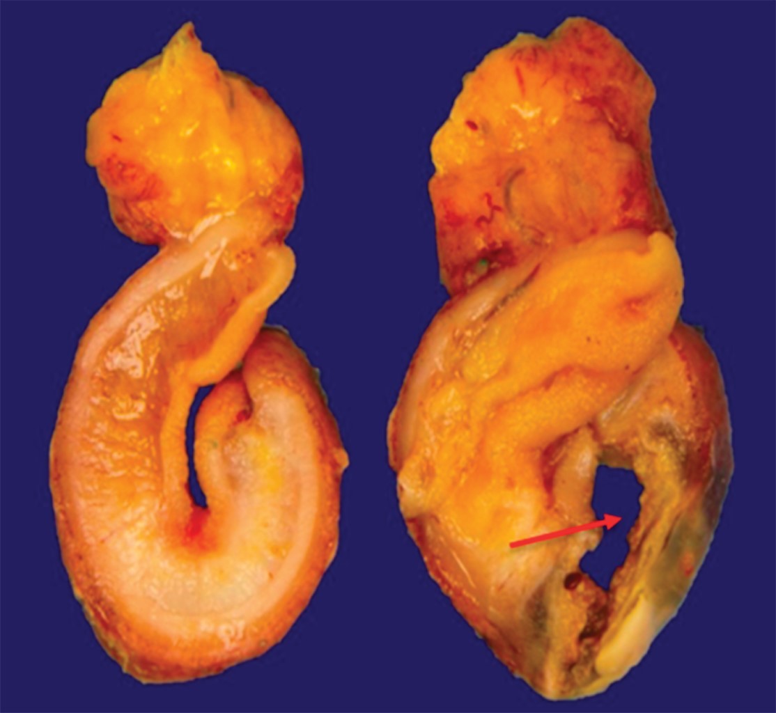 Debido a este hallazgo se realizó cirugía de urgencia; durante la exploración quirúrgica se encontró una perforación ileal proximal al sitio de la estenosis en el íleon terminal, la cual se encontraba sellada con la cápsula endoscópica in situ. Se realizó resección latero-lateral con anastomosis íleo-ileal con grapas. El examen histopatológico mostró inflamación transmural con úlceras y fibrosis extensa, consistente con ER, así como un área de perforación ileal (Figuras 2 y 3).