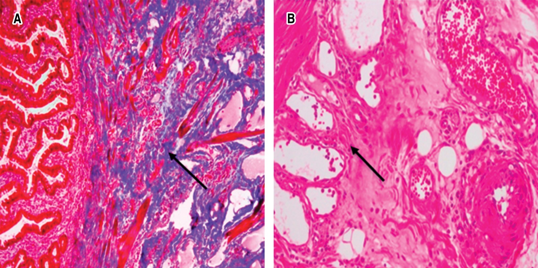 El daño inducido por radioterapia en tejido de proliferación rápida, tal como la mucosa intestinal, puede ser observado en tan sólo días o semanas.19 Los cambios en la arquitectura del intestino delgado se pueden dividir en agudos y crónicos. Los cambios agudos varían desde daño epitelial leve a necrosis masiva y ulceración, que pueden ser vistos incluso poco tiempo después de haber recibido radiación local. La enteropatía por radiación crónica se caracteriza por endarteritis obliterante progresiva, la cual causa isquemia del tejido que terminará progresando a fibrosis submucosa exagerada. Esta fibrosis empeora la isquemia preexistente y se forman vasos telangiectásicos, además de dilatación linfática como respuesta. Ambos cambios fueron apreciados en la biopsia realizada en nuestra paciente. Macroscópicamente, la enteritis por radiación se manifiesta con estenosis, formación de fístulas, abscesos locales, perforación y/o sangrado.20 A largo plazo, la mayoría de los pacientes sufrirán síntomas recurrentes o persistentes, y aproximadamente 10% morirán con una correlación directa a la enteropatía por radiación.21 Los estudios iniciales de elección cuando se sospecha enteritis por radiación crónica son tomografía axial computarizada y resonancia magnética, y cuando estos son negativos la CE representa uno de los mejores métodos para llegar al diagnóstico.20 Otra técnica utilizada en estos casos es la enteroscopia de doble balón (EDB).