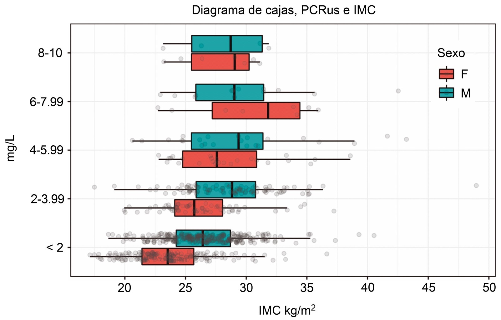 Diseño: estudio retrospectivo y transversal; se revisaron los registros de PCRus en pacientes de la Clínica Diagnóstica de un hospital privado de la Ciudad de México en el periodo de enero a junio de 2019. Para definir obesidad se utilizó la clasificación por medio del índice de masa corporal (IMC) de la Organización Mundial de la Salud. Para la medición por laboratorio de PCRus, se utilizó como punto de corte el propuesto por el Colegio Americano de Cardiología para estratificación de riesgo cardiovascular, en el que se clasifica en: bajo riesgo ( < 1 mg/L), riesgo moderado ( ≥ 1 mg/L) y riesgo alto ( ≥ 3 mg/L). Un valor ≥ 10 mg/L se considera como respuesta inflamatoria de fase aguda.