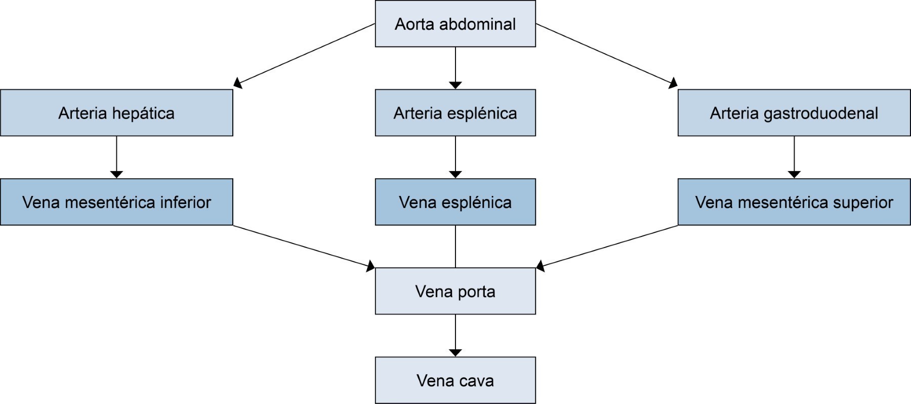 La enfermedad tromboembólica venosa se caracteriza por la aparición de un trombo en el interior del sistema venoso que puede llegar a causar obstrucción o embolismo. Estos trombos pueden aparecer en cualquier parte del sistema venoso, siendo lo más común en miembros inferiores y vasos pulmonares; sin embargo, existen sitios poco usuales donde se puede desarrollar trombosis, tales como vasos esplácnicos, cerebrales, ováricos, yugulares o en miembros superiores.4 Es importante mencionar que los factores de riesgo para trombosis venosa de sitios usuales suelen ser distintos a aquellas trombosis en sitios inusuales, destacando que depende del sitio donde se encuentre la trombosis y la causa de ésta,4 por lo que el conocimiento de la anatomía y secuencia de la circulación esplácnica es necesaria para comprender la relación que tiene con el páncreas y sus diferentes manifestaciones clínicas. Se presenta un diagrama de flujo para ilustrar la secuencia de la misma a continuación (Figura 1).