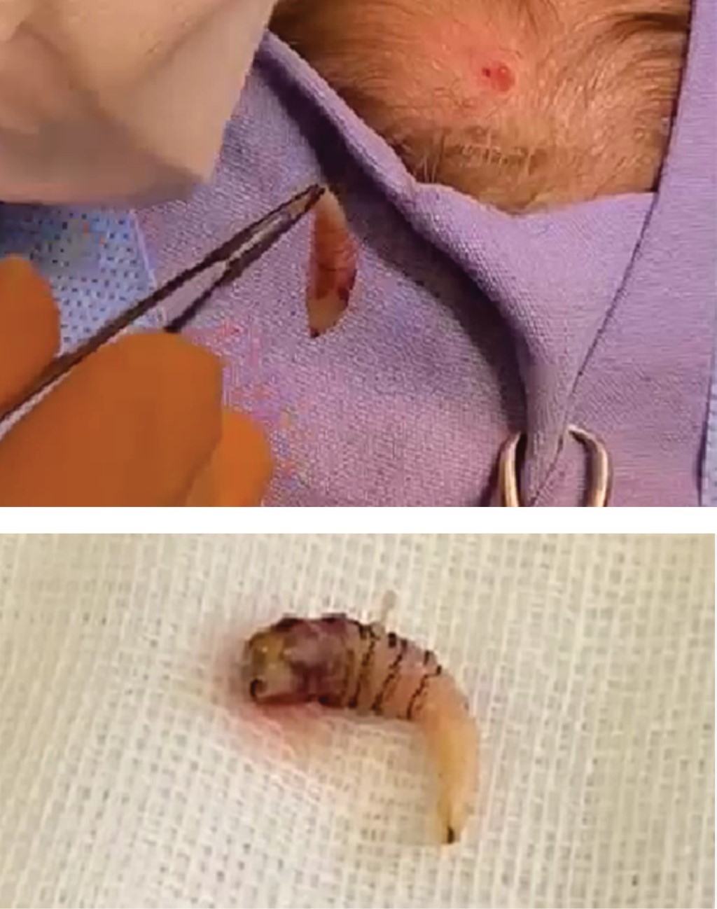 Paciente femenino de dos años que acude con médico pediatra por presentar pápula subcutánea en la región frontal, localizada en la piel cabelluda con aumento de volumen y eritema sin dolor a la palpación. Después de la revisión clínica la paciente fue enviada para la realización de ultrasonido (Figura 1), con sospecha de cuerpo extraño versus hematoma. Por último, es explorada quirúrgicamente obteniendo con claridad la larva de la mosca (Figura 2). La paciente tuvo una evolución favorable y fue dada de alta definitiva a las 72 horas.
