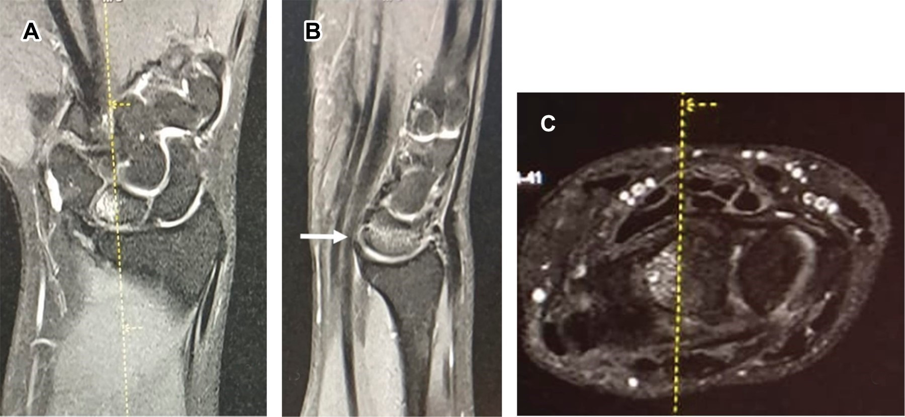 Femenino de 28 años, con dolor de un año en cara dorsal de muñeca, las radiografías simples fueron normales (Figura 1). La resonancia magnética (RM) (Figura 2) mostró incremento de señal en la porción medial del semilunar derecho, correspondiendo a necrosis avascular del semilunar (enfermedad de Kienböck), entidad descrita en 1913, caracterizada por necrosis del hueso semilunar. Generalmente afecta a varones entre los 20 y 40 años, originada por interrupción de la vascularización del hueso semilunar, que inicialmente sufre isquemia y posteriormente necrosis, ocasionando artrosis de muñeca; tiene origen multifactorial, como: factores genéticos, anatómicos, vasculares, traumáticos y ocupacionales. Los pacientes generalmente consultan por dolor de larga evolución, generalmente centrado en el dorso de la muñeca que empeora con la actividad física, puede haber inflamación difusa y dificultad para soportar carga. El diagnóstico clínico debe confirmarse mediante radiografías (que en fases iniciales pueden ser normales) y RM. El tratamiento depende de la etapa de la enfermedad, diferenciando entre estadios aún reversibles o no; en los primeros, las técnicas incluyen injertos vascularizados y las osteotomías de acortamiento para quitar presión al hueso semilunar. En etapas irreversibles, las distintas posibilidades para mejorar la función incluyen las denervaciones, la resección de primera fila del carpo y artrodesis parciales, como último recurso para el control del dolor se reserva la artrodesis total de muñeca.