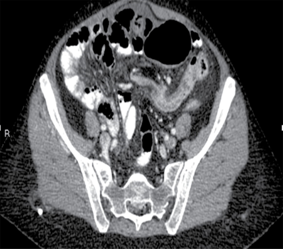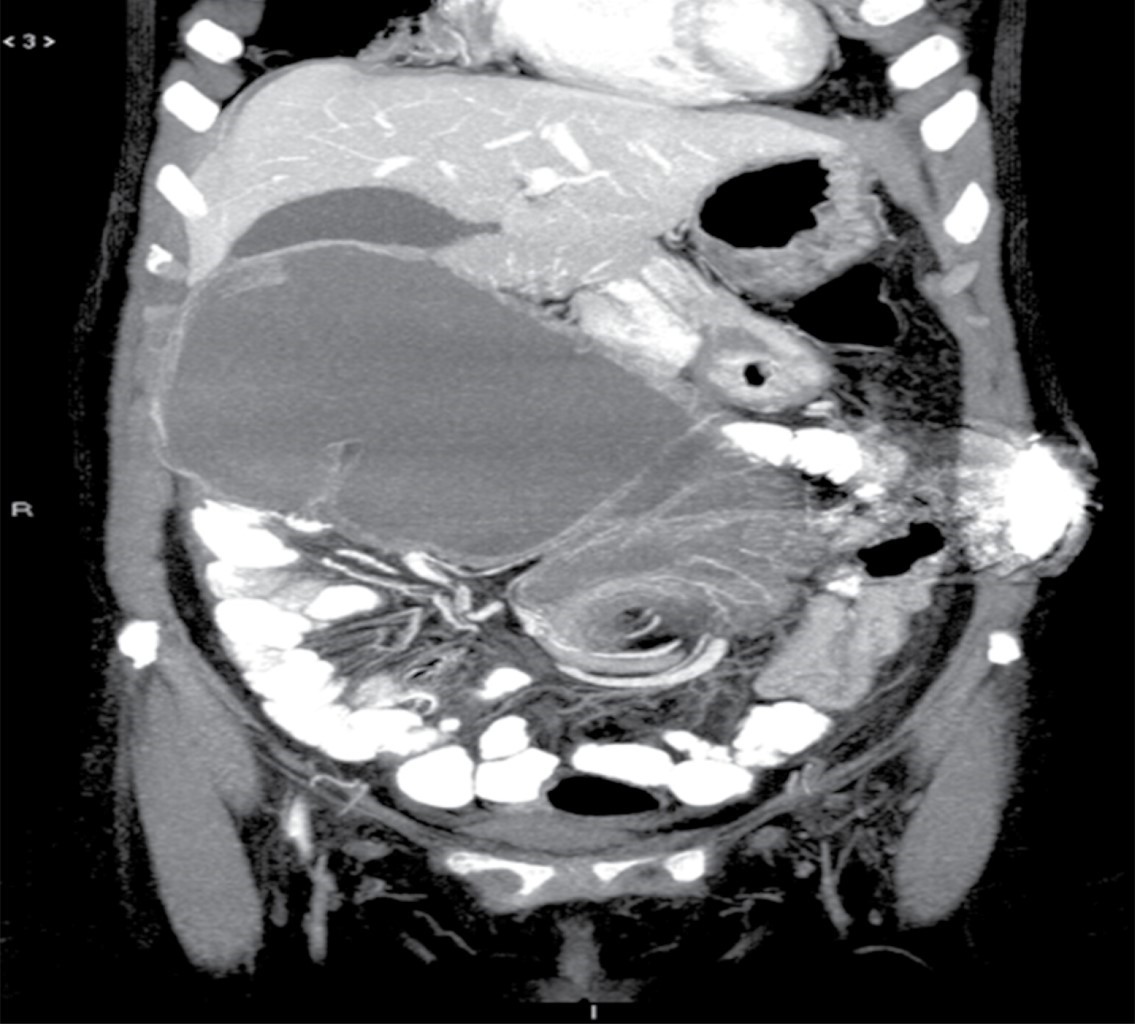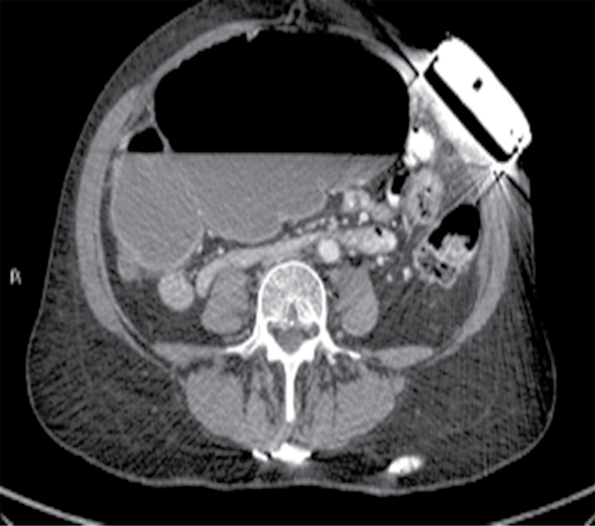 Presentamos el caso de un paciente femenino de 65 años con antecedentes de artritis reumatoide de larga evolución tratada con prednisona; neuralgia postherpética tratada con la colocación de una bomba de infusión analgésica durante cinco años y hernia ventral epigástrica no complicada de dos años de evolución. La paciente se presentó al Servicio de Urgencias con dolor abdominal tipo cólico, de inicio súbito e intensidad 8/10 en la escala visual análoga (EVA); distensión abdominal, obstipación y vómito de características intestinales en múltiples ocasiones.