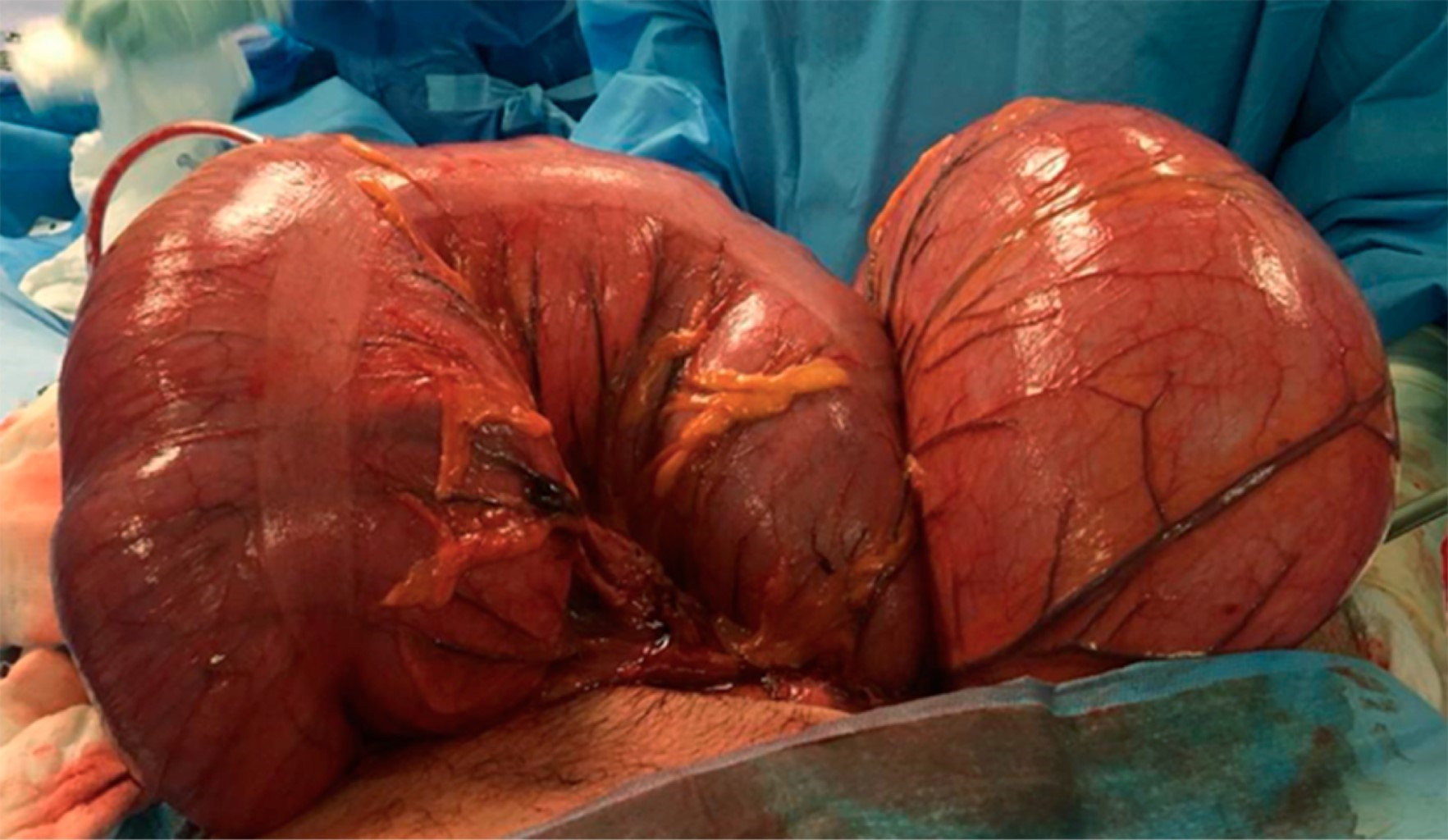 Decidimos realizar una exploración quirúrgica de cavidad abdominal mediante laparotomía media, con disección de contenido y saco herniario a nivel de epigastrio. Posteriormente, acceso a cavidad abdominal en donde se encuentra vólvulo de ciego acompañado de distensión de hasta 12 cm desde el ciego hasta el tercio medio del colon transverso. Se encuentra malrotación intestinal desde el ángulo de Treitz secundario a la presencia de adherencias congénitas hacia la pared abdominal, llamadas bandas de Ladd. Se encontró el hemicolon derecho con una zona extensa de necrosis, por lo que se realizó hemicolectomía derecha con posterior anastomosis mecánica íleo-transversa laterolateral, con engrapadora GIA 60 mm cartucho azul (Figura 5). Posterior a lavado exhaustivo de cavidad abdominal, se colocan dos drenajes tipo Blake 19 Fr. Se cierra pared abdominal por planos, afrontando aponeurosis con sutura Prolene 1 en sutura continua.