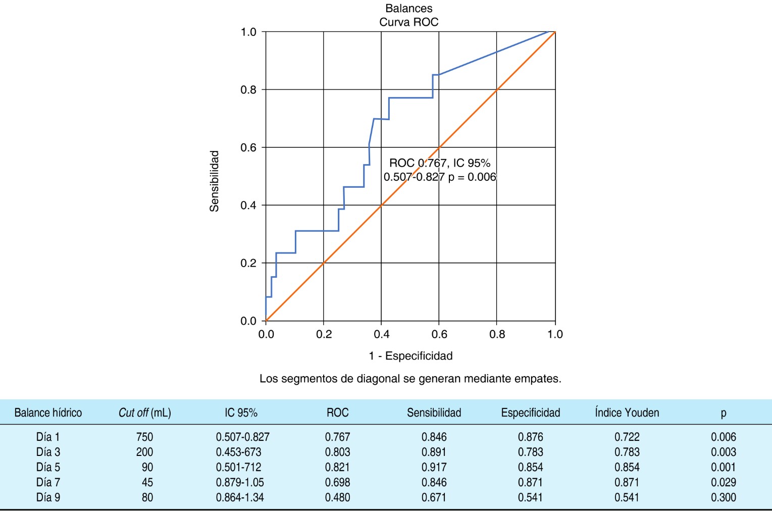 El mejor punto de corte elegido fue en el balance de líquidos de acuerdo al índice de Youden descrito en el pie de Figura 1, observando significancia del día 1 al 7, el día 9 no alcanzó una curva ROC ni una significancia estadística, por lo tanto no se incluyó en el análisis.