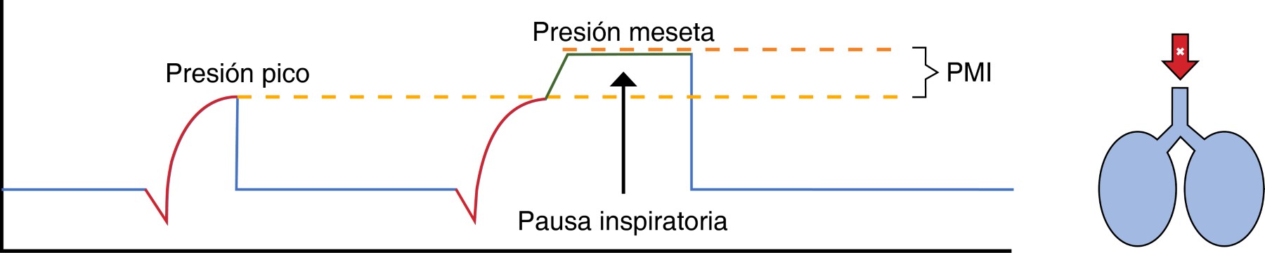 La PFI nos permite medir la Pmeseta, meta clave de la ventilación protectora en SDRA, asociada a mortalidad en valores > 27 a 30 cmH2O, por lo que se recomienda medir al menos una vez cada 12 h,5 aunque podría considerarse medirla de manera más frecuente en caso de existir cambios significativos en la mecánica ventilatoria del paciente como disminución de la Cst o modificaciones en el Vt o PEEP. La medición puede hacerse de forma simple con el comando de pausa inspiratoria manual en una duración de 0.2 a 3 s.3