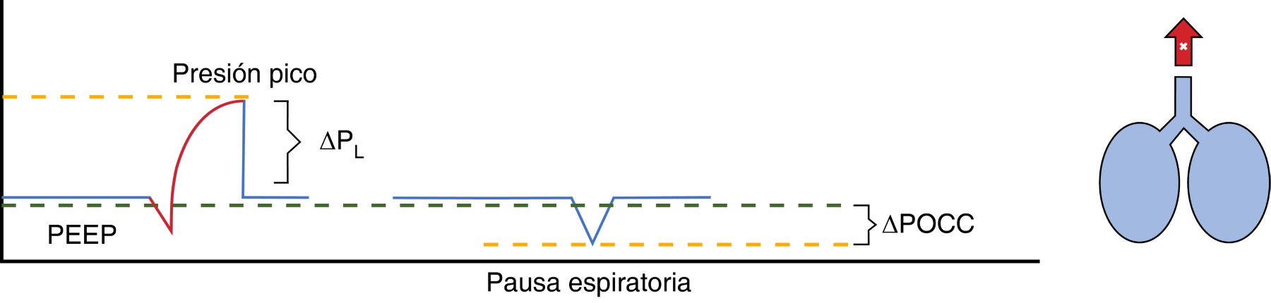 Asimismo, la PFI permite evaluar la driving pressure (DP) transpulmonar dinámica (ΔPL) de manera confiable,29,30 esta presión indica la tensión pulmonar dinámica durante cada inspiración en ventilación espontánea,28,31 para su evaluación previamente se necesita la medición de la presión de deflección durante la oclusión (ΔPOCC) mediante una pausa espiratoria durante un solo esfuerzo inspiratorio o 5 s, que desenmascara el esfuerzo de músculos respiratorios y se genera una presión negativa que puede o no vencer la PEEP programada, una vez obtenida la ΔPOCC podrá estimarse la ΔPL y asimismo la presión muscular (Pmus)29-33 (Figura 3).