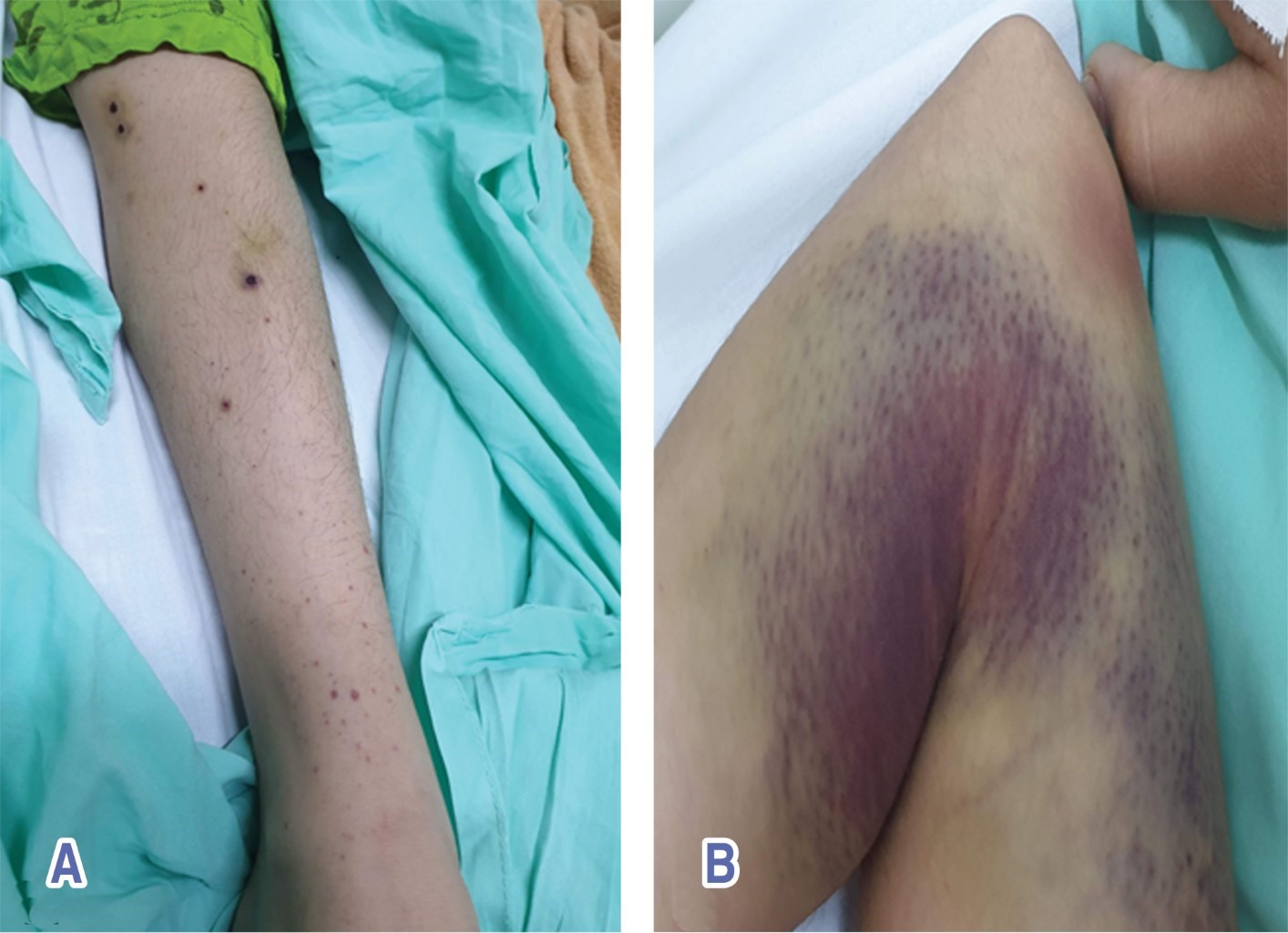 Al examen físico inicial: paciente eutrófica con peso: 42.6 kg, talla: 144 cm (-0.98 puntuación Z), índice de masa corporal (IMC): 20.5 (0.92 puntuación Z). Se observó sangrado activo por fosas nasales, sangrado conjuntival en ojo izquierdo y múltiples lesiones costrosas difusas, distribuidas en tronco y extremidades. Asimismo, había lesiones petequiales y purpúricas de predominio en extremidades (Figura 1A y B). La auscultación cardiopulmonar fue normal y no se detectó hepatomegalia o esplenomegalia.