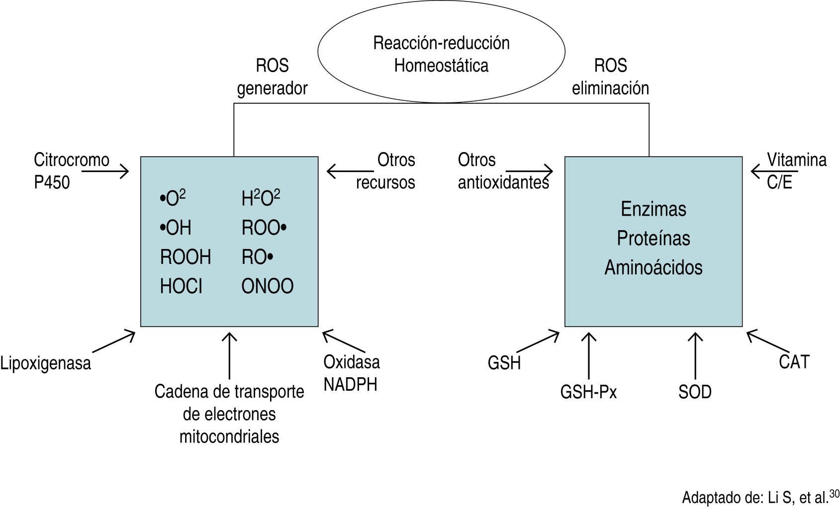 Las reacciones de oxidación y reducción (Redox) se encuentran presentes en casi cualquier proceso biológico. Las interacciones entre oxidantes endógenos y exógenos, y los sistemas antioxidantes, tanto enzimáticos como no enzimáticos, tienen implicaciones fisiopatológicas fundamentales, desde el equilibrio ácido-base, procesos bioenergéticos, oxidación de ácido desoxirribonucleico (ADN) y ácido ribonucleico (ARN), así como sus mutaciones, hasta un estado de excesiva oxidación relacionada con el desarrollo de enfermedades. En el metabolismo aeróbico, estas reacciones producen radicales libres. Los radicales libres son moléculas químicas inestables que tienen un electrón desapareado y se caracterizan por ser altamente reactivos con otras moléculas, son subproductos del metabolismo y oxidación de ácidos grasos en los peroxisomas, mitocondrias y retículo endoplásmico liso. Los radicales libres más comunes son anión superóxido (O2–), radical hidroxilo (OH–), radicales peroxilo (ROO–) y radical alcoxi (RO–), de los cuales el radical hidroxilo es el más potente, sustrae un átomo de hidrógeno del grupo metileno (-CH2–) de los ácidos grasos, dejando una enlace libre en el átomo de carbono (-CH–), iniciando una reacción en cadena, tomando hidrogeniones de las otras moléculas de ácidos grasos hasta que el sustrato es consumido totalmente o la reacción es detenida por una molécula antioxidante. Existen además otros radicales libres no asociados al oxígeno1,2 (Figura 1).