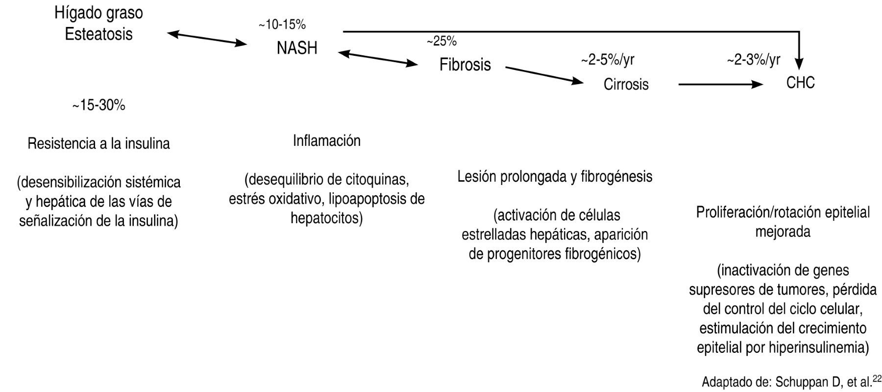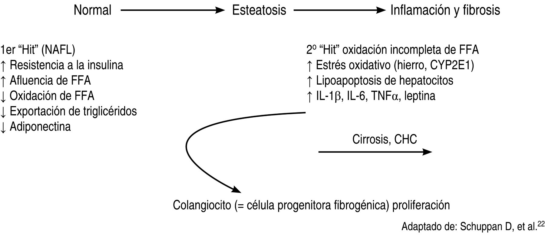 Todo lo que se sabe sobre la fisiopatología de NASH ha permitido formular la teoría de "multiple hits", en la que los factores dietéticos, genéticos y epigenéticos, sumados a la obesidad, derivan en elevación de los niveles séricos de ácidos grasos libres y colesterol, desarrollando resistencia a la insulina, proliferación de los adipocitos y cambios en el microbioma intestinal. La resistencia a la insulina en tejidos empeora la disfunción de los adipocitos, induce lipólisis y promueve la liberación de adipocinas y citocinas proinflamatorias como TNF-α e IL-6; lo cual contribuye al mantenimiento del estado de insulinorresistencia. En el hígado, el aumento de ácidos grasos libres y los cambios en el microbioma provocan aumento en la síntesis y acumulación de triglicéridos, junto con disfunción mitocondrial por el incremento del estrés oxidativo y la producción de radicales libres de oxígeno, lo que promueve la inflamación hepática. Otro factor importante relacionado es el eje intestino-hígado. Algunos estudios han demostrado que el consumo de dietas altas en grasas deteriora la barrera intestinal. El aumento de permeabilidad del intestino delgado permite la traslocación de moléculas que contribuyen a la activación del inflamosoma e incrementa el estrés del retículo endoplásmico.21 El hígado graso muestra elevación en la susceptibilidad ante la peroxidación lipídica con incremento de especies reactivas de oxígeno como respuesta, causando mutaciones en el ADN. Aunado a esto, algunos factores genéticos juegan un papel en la patogenia. Las variaciones en proteínas como la adiponutrina (PNPLA3) y la superfamilia 2 transmembranal 6 (TM6SF2) se han visto implicadas en las alteraciones en metabolismo lipídico y el aumento de la esteatosis hepática. El hígado de pacientes con obesidad es más susceptible a la carcinogénesis como resultado de daño de la producción de ATP, sumado a un mecanismo de apoptosis defectuoso y desregulación energética y/o balance hormonal, hipoxia e inflamación sistémica.