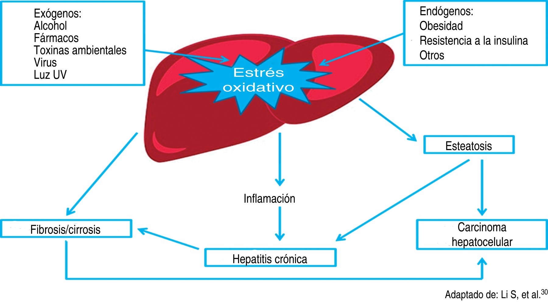 El estrés oxidativo y las reacciones de óxido-reducción se encuentran presentes en todos los procesos biológicos. En pacientes con síndrome metabólico, contribuyen al desarrollo de esteatohepatitis no alcohólica, cirrosis y carcinoma hepatocelular, mediante procesos de lipotoxicidad, reclutamiento de citocinas, activación de células estelares, síntesis progresiva de colágena, DAMPs (patrón molecular asociado a lesiones), PAMPs (patrón molecular asociado a patógenos) y daño irreversible al ADN mitocondrial. Nrf2 es el factor de transcripción más importante en la regulación de la expresión de los genes de la respuesta antioxidante enzimática y juega un papel primordial en la respuesta citoprotectora ante la inflamación aguda y en la regeneración hepática. Sin embargo, se ha asociado también al desarrollo de quimiorresistencia y recurrencia tumoral. En este artículo, hacemos una revisión sobre la evidencia existente al respecto.REACCIONES DE OXIDACIóN Y REDUCCIóN Y SU RELACIóN CON LA ENFERMEDAD HEPáTICA