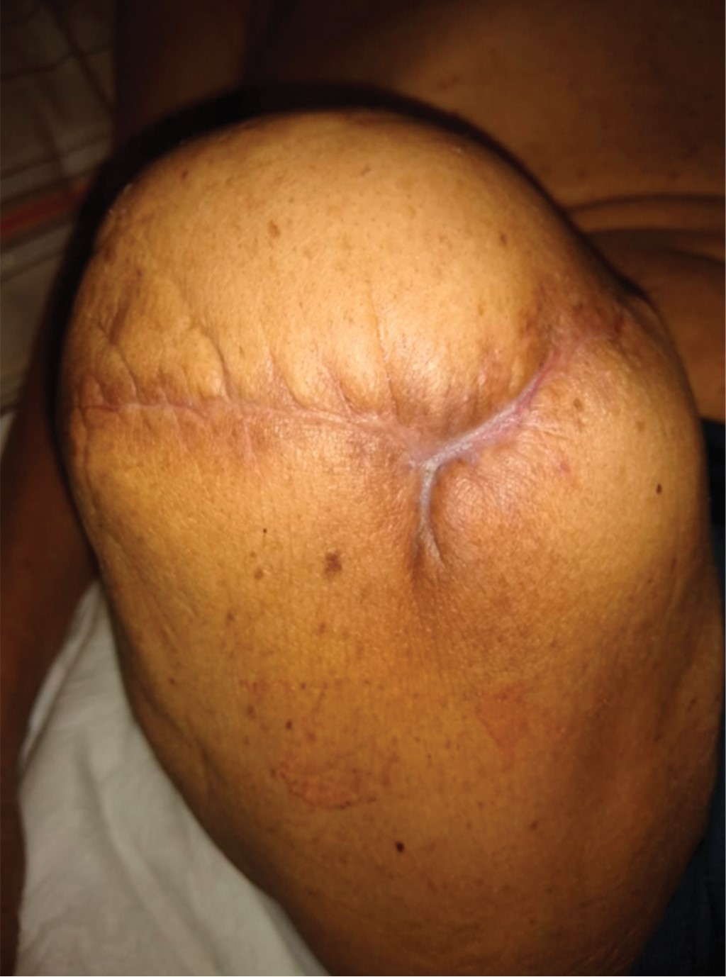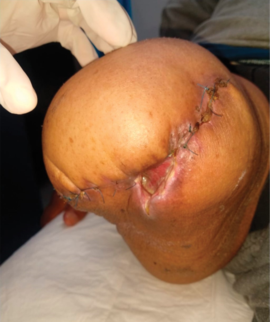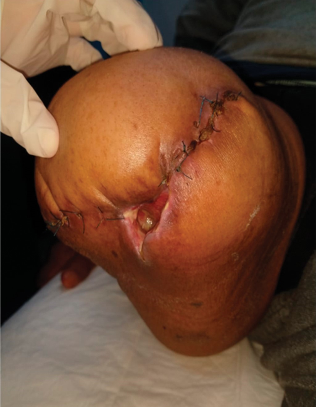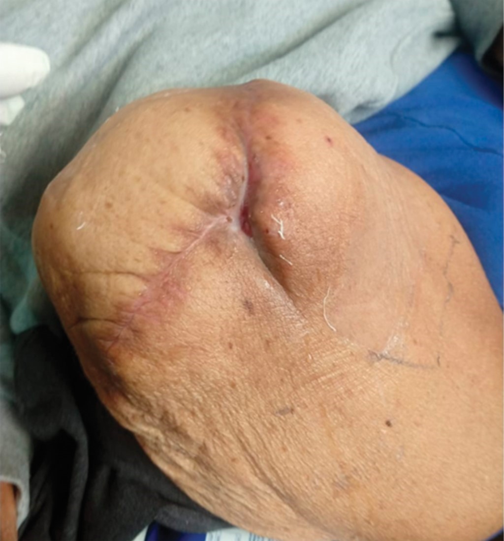 En agosto de 2019, como consecuencia del traumatismo constante de la prótesis sobre el muñón desarrolla una úlcera (Figura 1), la cual evoluciona de manera desfavorable aumentando la isquemia y presentando necrosis de tejidos blandos y exposición de tibia (Figura 2); razón por la que se presenta al Servicio de Urgencias del Hospital General de México, atendido por el Servicio de Cirugía General, realizando ultrasonido Doppler con reporte de ausencia de flujo arterial distal en 90%, ameritando amputación supracondílea, la cual se llevó a cabo en noviembre de 2019 con los siguientes hallazgos: tejidos blandos sin presencia de infección ni edema, arteria y vena femoral ocluidas por placa de ateroma en 95% de su luz. Recibió antibioticoterapia con amoxicilina/clavulanato 875/125 mg por siete días cada 12 horas. Es egresado al noveno día postquirúrgico; dos semanas después el paciente acude a consulta de seguimiento, evidenciándose un aumento importante de volumen en el muñón, eritema e incremento de la temperatura local, bordes de la herida quirúrgica macerados y escasas natas de fibrina; se realiza radiografía del muslo, encontrando imágenes sugestivas de gas, por lo que se decide retiro de sutura de forma parcial, drenando 800 cm3 de líquido seroso, no fétido y presencia de tres trayectos, el mayor de ellos en el compartimento anteromedial del muslo de aproximadamente 15 × 8 × 8 cm (Figura 3). Se realiza toma de cultivo de herida basal sin desarrollo. Por consulta externa se comienzan curaciones mediante irrigación con solución fisiológica al 0.9% durante dos semanas, sin lograr un cierre adecuado; razón por la que se decide implementar manejo con apósitos de PHMB, los cuales se interiorizan en los trayectos, ocupando la totalidad del espacio muerto hasta el borde externo de la herida con previa técnica aséptica (jabón quirúrgico y solución salina estéril), además de desbridar natas de fibrina de los bordes, así como tejido desvitalizado con bisturí; se realizó cambio de los apósitos cada cinco días, observando durante cada curación el cierre de los trayectos con formación de tejido de granulación en dirección proximal a distal; a las cuatro semanas de tratamiento se observó una reducción de 60% del tamaño de la herida (Figura 4), empleando en cada nueva revisión menos cantidad de apósito con granulación completa a las ocho semanas (Figura 5), hasta presentar cierre de la herida en su totalidad 11 semanas después de haber iniciado el tratamiento (Figura 6). Actualmente el paciente no presenta complicaciones del muñón, continúa en seguimiento de patologías sistémicas.