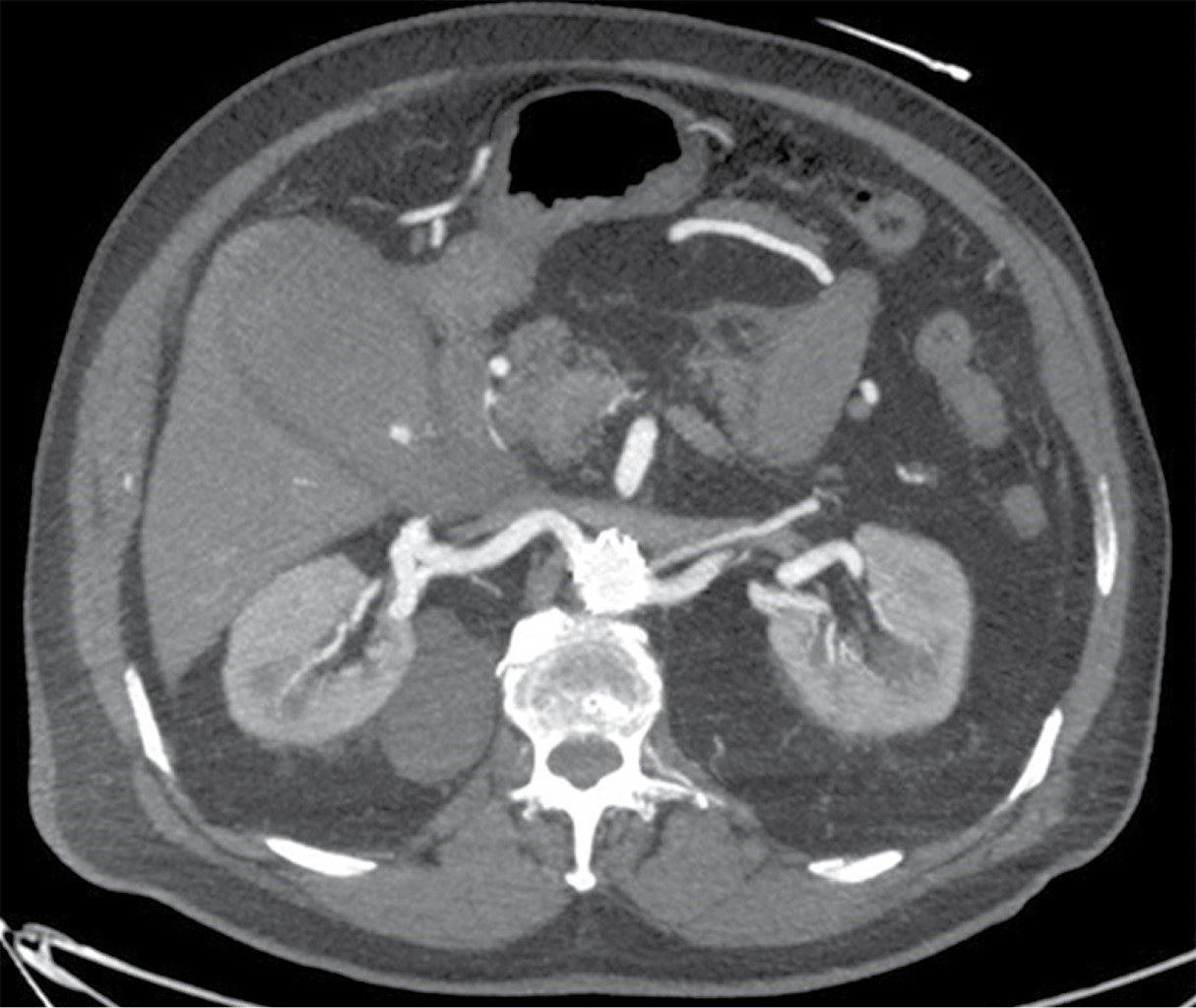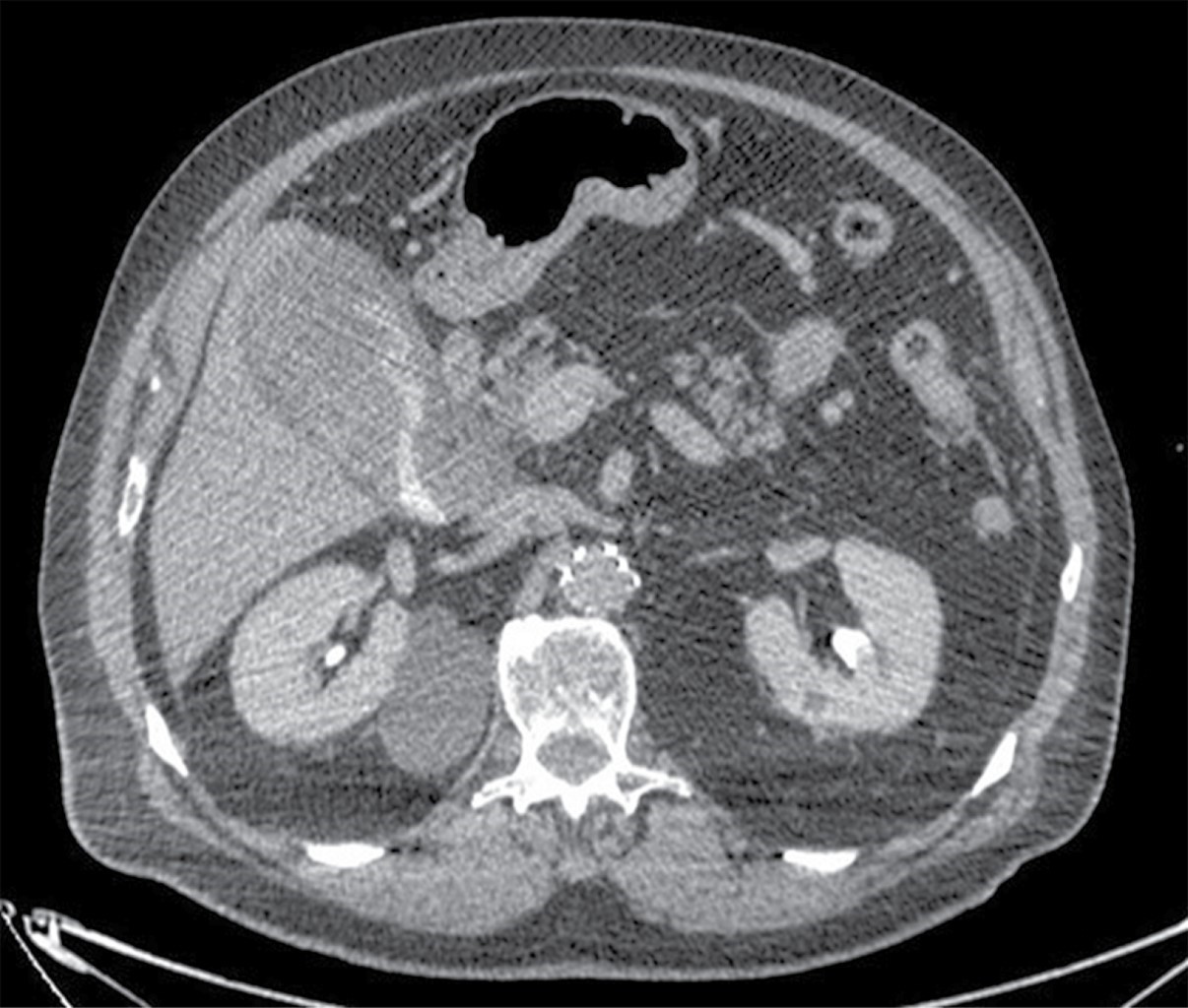 Paciente masculino de 77 años de edad con el antecedente de cardiopatía isquémica no especificada en 2001, tratada con la colocación de dos stents coronarios en acompañamiento con ácido acetilsalicílico; además de tromboembolia pulmonar en 2009, en tratamiento con acenocumarol; y aneurisma aórtico tratado en 2012 con stent aortoiliaco. Acudió a urgencias por presentar dolor abdominal difuso con 12 horas de evolución e intensidad 8/10 en escala de EVA, sin irradiaciones, sin exacerbantes, con náusea sin vómito, se automedicó con butilhioscina y presentó mejoría parcial de 6/10 en escala de EVA. A la exploración física se encontró Glasgow de 15, saturación a 90%, hipertensión arterial 211/116, temperatura de 36 oC, frecuencia respiratoria 13 y abdomen globoso con datos de irritación peritoneal. Los laboratorios reportaron hemoglobina 18.5 g/dl (14.5-18.5), hematocrito 54.4% (42.0-50.0), leucocitos 13.9 103/μl (4.8-10.0), plaquetas 170 103/μl (150-450), TP 42.34 segundos (9.60-12.00), INR 4.33 (0.90-1.20) y TTPa 34 segundos (22-35). Por los antecedentes médicos y quirúrgicos, se decidió realizar angiotomografía computarizada, que reportó sangrado activo hacia la luz de la vesícula biliar (Figuras 1 y 2), hemoperitoneo, stent aortoiliaco permeable y en situación normal, y arteria mesentérica inferior obliterada. Se decidió su ingreso a Terapia Intensiva para estabilización hemodinámica, se transfundieron seis Octapro® (factores de la coagulación IX, II, VII y X), dos paquetes globulares, cuatro plasmas y tres aféresis plaquetarias, además se realizó colecistectomía laparoscópica dos horas después de su ingreso hospitalario.