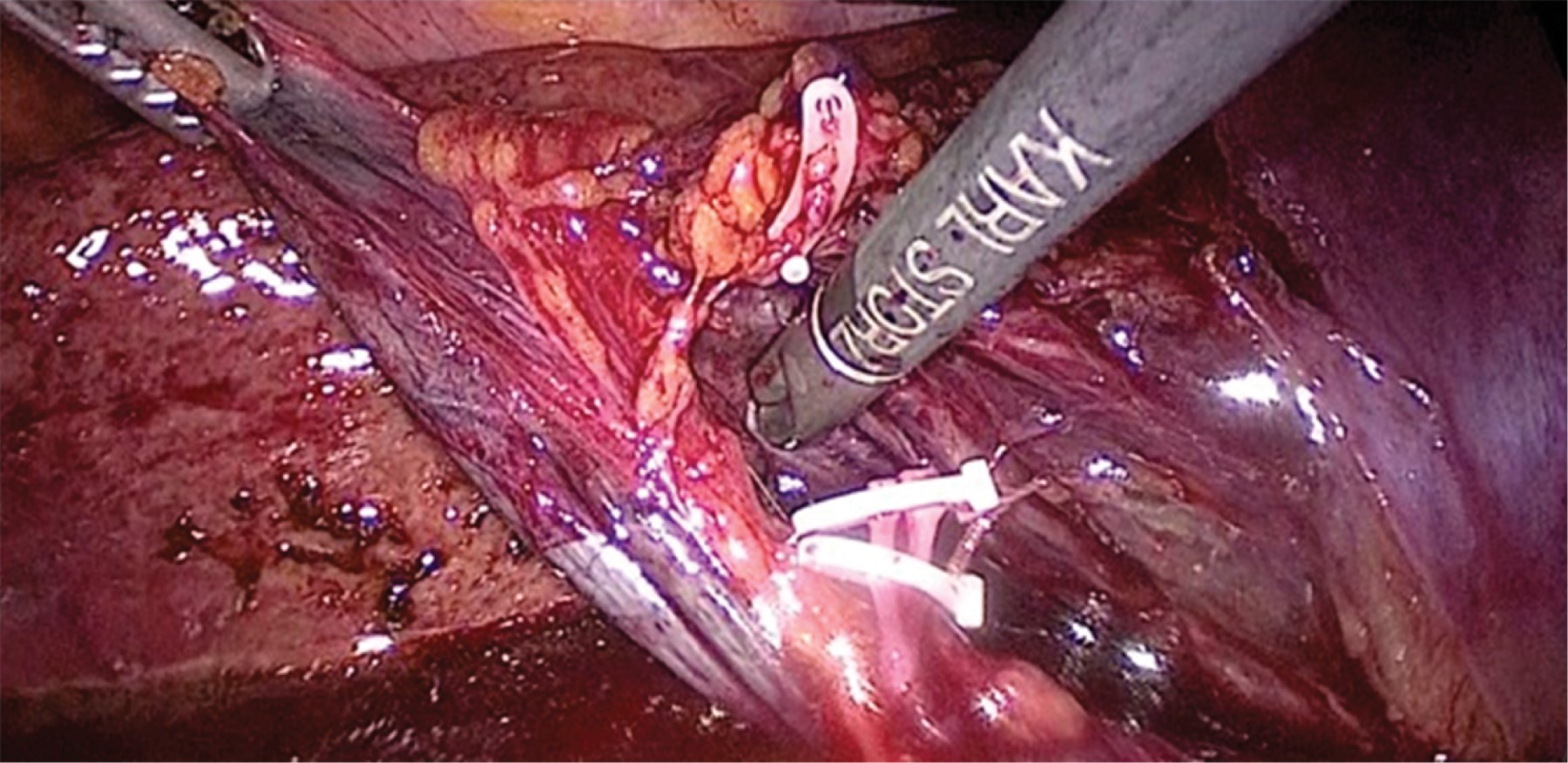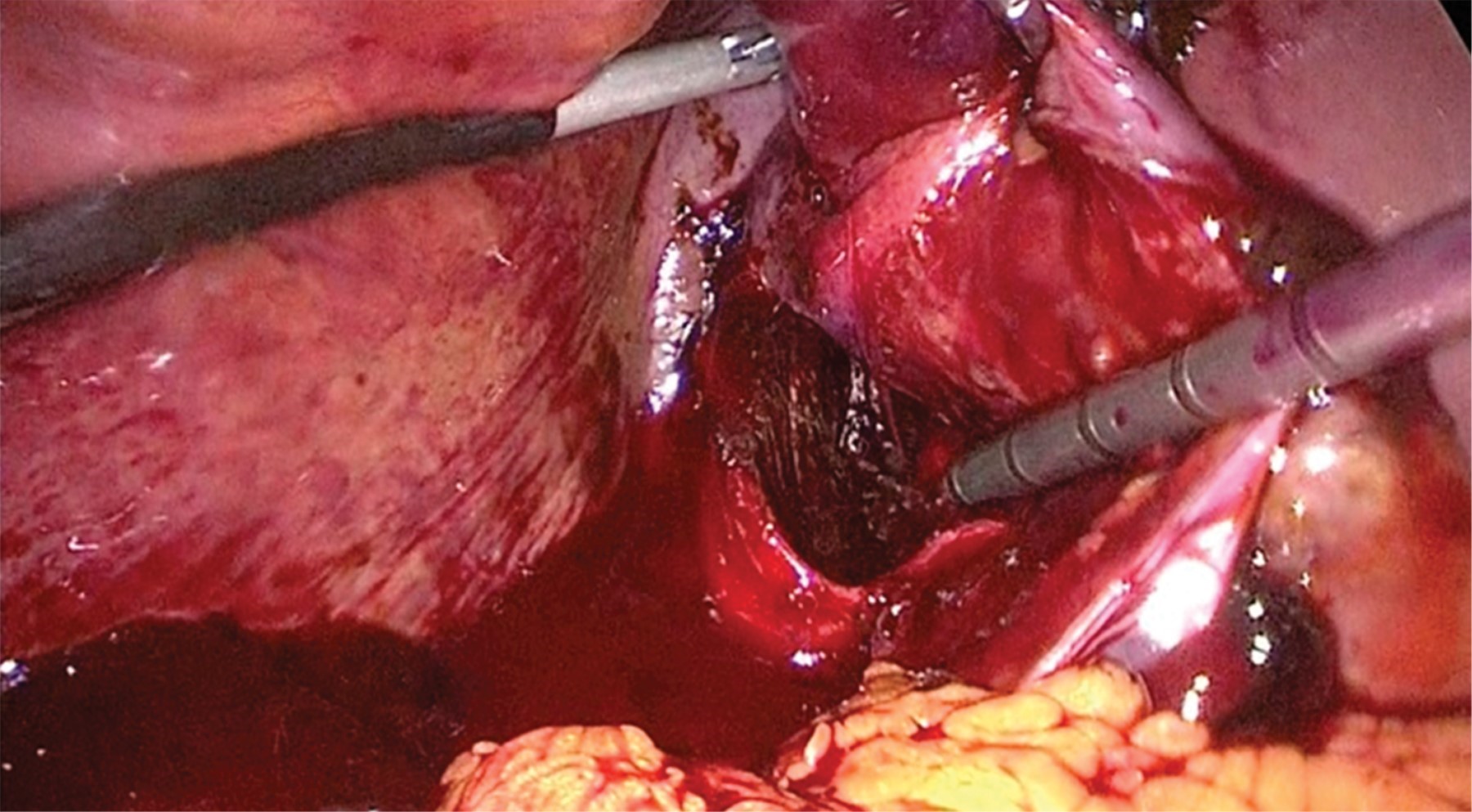 Bajo anestesia general, se colocó al paciente en posición americana; se realizó neumoperitoneo por puerto de 12 mm transumbilical con técnica abierta; se colocó, bajo visión directa, puerto de 10 mm subxifoideo y dos puertos de trabajo de 5 mm; se llevó a cabo laparoscopia diagnóstica que encontró vesícula biliar perforada, hemoperitoneo y sangrado activo intravesicular (Figura 3); se ejecutó aspirado de hemoperitoneo y bilis; se efectuó tracción cenital de vesícula biliar y disección de arteria cística; se practicó clipado con Hem-O-Lok® en arteria y conducto cístico, previa vista crítica (Figura 4); se resecó vesícula biliar con bisturí armónico; se retiró pieza quirúrgica utilizando bolsa endoscópica; se hizo lavado de cavidad y aspirado; se colocó Surgicel® en lecho quirúrgico y drenaje tipo Blake 19 Fr; se retiraron puertos de trabajo, bajo visión directa, sin evidencia de sangrado; se afrontó aponeurosis y piel; y se dio por concluido el acto quirúrgico; por último, se reportaron 1,000 ml de sangrado y un tiempo quirúrgico de 100 minutos. El paciente presentó buena evolución postquirúrgica, toleró la vía oral en el segundo día y se decidió su egreso en el quinto día postquirúrgico. Reporte de patología: vesícula biliar con colecistitis aguda perforada con necrosis transmural, no se observan datos de malignidad.