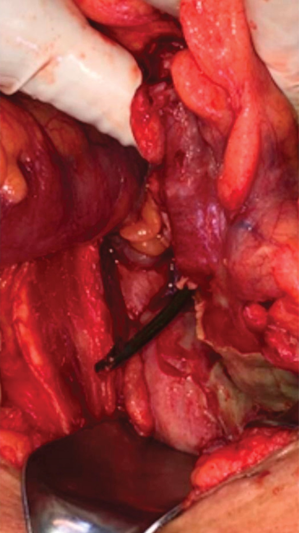 La paciente fue sometida a laparotomía exploradora, se encontró una perforación de un centímetro de diámetro a través de un divertículo del colon sigmoides secundario a la endoprótesis (Figura 3), y múltiples divertículos de sigmoides no complicados. Se extrajo la endoprótesis, se desbridaron los bordes intestinales de tejido sano y se realizó el cierre primario en dos planos, el interno por medio de sutura continua con poliglactina 910 calibre 3-0 y el externo a través de puntos tipo Lembert con seda calibre 3-0. No se evidenció peritonitis localizada o generalizada, pero de cualquier manera se colocó un drenaje de succión cerrada calibre 12 Fr, abocado a corredera parietocólica y pelvis. La evolución postoperatoria transcurrió sin incidentes, se administró ceftriaxona 2 mg cada 24 horas por vía intravenosa y metronidazol 500 mg cada ocho horas; la paciente egresó al cuarto día del postoperatorio, con indicación de cumplir cinco días más de metronidazol 500 mg cada ocho horas por vía oral.