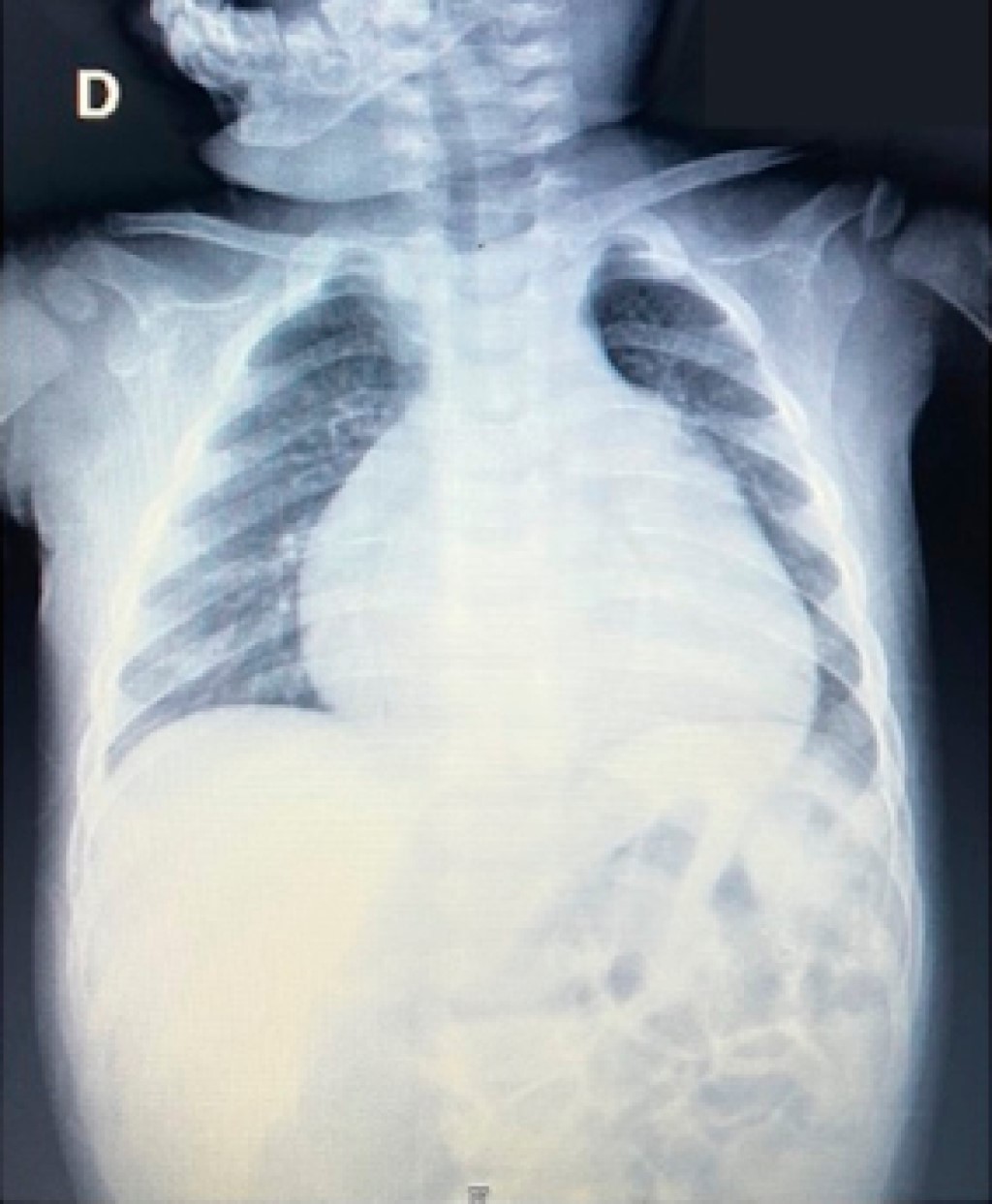 Masculino de un año y cuatro meses sin antecedentes de importancia, ingresó al Departamento de Urgencias por presentar disnea y diaforesis con la alimentación. A la exploración física con oximetría de pulso de 85%. En la radiografía de tórax se observó cardiomegalia a expensas de cavidades derechas con índice cardiotorácico de 0.68 (Figura 1). En el electrocardiograma se encontró ritmo sinusal, con frecuencia cardiaca de 150 latidos por minuto, desviación del eje eléctrico a la derecha con crecimiento de las cavidades derechas.
