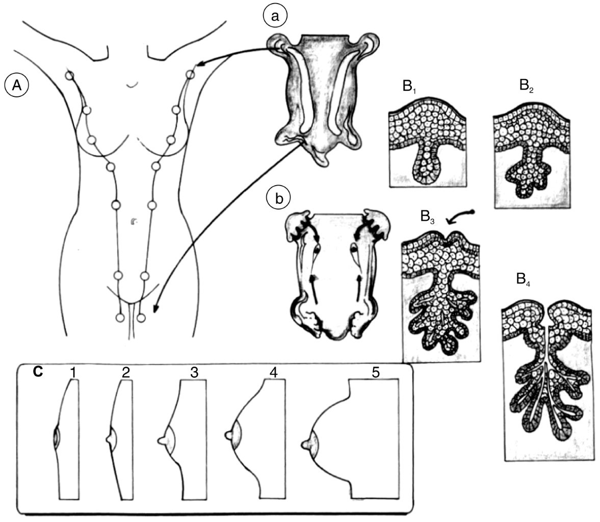 Las líneas mamarias se observan por primera vez en la pared ventral del feto durante la sexta semana de gestación, extendiéndose bilateralmente desde el tercio lateral de la clavícula hasta la sínfisis del pubis. Las líneas mamarias presentan regresión excepto en el área torácica bajo la influencia de diversas hormonas que se diferenciará en tejido mamario que dará origen a la glándula mamaria (Figura 1A, b). En el quinto mes de gestación ya se observa el pezón, la aréola y una ramificación de 15 a 25 conductos, junto con tejido conectivo de sostén. Al llegar a la semana 32 de gestación la glándula crece por influencia de las hormonas maternas. En la mayoría de los neonatos a término es palpable el tejido mamario de aproximadamente 8 mm. El crecimiento de la glándula continúa después del nacimiento, alcanzando en promedio los 14 mm de diámetro. Subsecuentemente cada yema primaria da origen a varias yemas secundarias que se diferencian en conductos galactóforos (lactíferos) y sus ramas (Figura 1B; B-1 a la B-4). La canalización de estas yemas para formar conductos es inducida por hormonas sexuales de la placenta que alcanzan la circulación fetal. Esto continúa hasta término con la formación de 15 a 20 conductos galactóforos (Figura 1B-4). Mientras tanto el tejido conjuntivo fibroso y la grasa de la glándula mamaria se desarrollan del mesénquima circundante. Al final del periodo fetal, la epidermis se deprime en el sitio de origen de las glándulas mamarias, que en conjunto con la proliferación del tejido conectivo circundante a la aréola y el área circular de piel que rodea al pezón, dan origen a la fovea mamaria (Figura 1B-3). En los recién nacidos se pueden observar los pezones recién formados y deprimidos. Las células mesenquimatosas vecinas se diferencian y forman las fibras de músculo liso del pezón y de la aréola. Al nacer sólo están formados los principales conductos galactóforos y la glándula mamaria permanece latente hasta la pubertad. Las glándulas mamarias son idénticas, se desarrollan en forma similar y tienen la misma estructura en ambos sexos.
