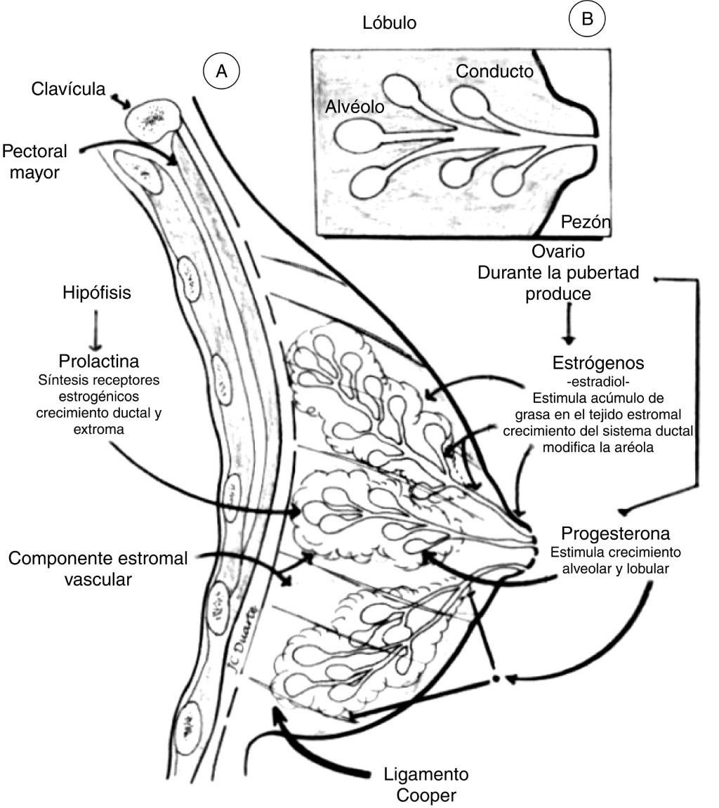 La evolución normal del crecimiento de los senos ha sido clasificada en 5 estadios clínicos (Vg. Taner, figura 1-C). Las hormonas reguladoras de crecimiento son esencialmente tres: las dos hormonas esteroides de origen ovárico, los estrógenos y la progesterona; y una hormona proteica de origen hipofisiario, la prolactina. En respuesta al peculiar equilibrio y las diferentes concentraciones de éstas, se desarrollan los diferentes componentes del tejido mamario. Al llegar a la pubertad el estímulo más importante es el del estrógeno, particularmente el estradiol, el más activo de la familia secretada por el ovario puberal. A causa de éste se modifica la aréola y se inicia el depósito de tejido subareolar; gran parte de la acción estrogénica en etapas tempranas se resume en el acúmulo de grasa en el tejido conectivo estromal, asimismo tiene máxima influencia sobre el crecimiento de los conductos galactóforos (Figura 2-A). En esta etapa también son importantes las concentraciones de prolactina que induce la síntesis de receptores estrogénicos en el tejido mamario. Secundario al estímulo simultáneo de estas dos hormonas se inicia el crecimiento específico del sistema glandular, del estroma y del epitelio. El crecimiento y desarrollo del componente alveolar requiere del estímulo adicional de la progesterona, cuya síntesis ovárica en forma cíclica sólo se da en etapas más tardías de la pubertad, al establecerse ciclos ovulatorios normales (Tabla 1). La progesterona inicia el desarrollo alveolar-lobulillar (Figura 2-A). Aún no se conoce el mecanismo mediante el cual la glándula mamaria detiene su crecimiento.