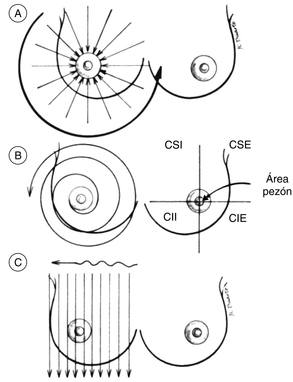 Círculos concéntricos: la palpación del seno se realiza efectuando círculos concéntricos o en forma espiral desde el pezón hasta el límite exterior del seno (Figura 3B).