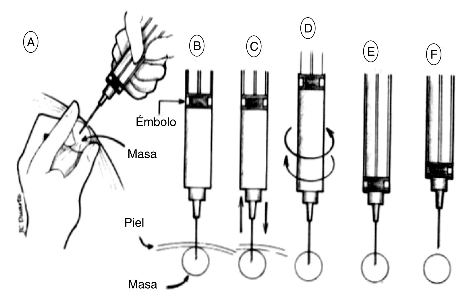 - 4. Se punciona directamente introduciendo la aguja en la masa, realizando múltiples movimientos de entrada, salida y rotatorios, en diferentes direcciones.