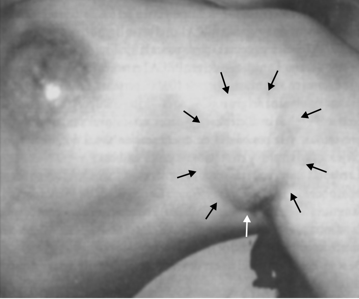 El hemangioma y la malformación linfática macroquística (antes linfangioma quístico), son las causas menos frecuentes de masa en la glándula mamaria (Figura 8). El hemangioma involuciona espontáneamente una vez que termina su fase proliferativa (0 a 12 meses) y generalmente produce hipoplasia del seno si la yema mamaria se encuentra cercana a la lesión. Se desarrolla en el tejido de sostén de la glándula mamaria, como una masa de crecimiento rápido, unilateral y que provoca deformidad asimétrica. La piel suprayacente se eleva, torna tibia y de color azulado. Las venas que drenan el hemangioma se disponen en forma radial sobre la lesión. Estudios recientes utilizando resonancia magnética nuclear (RMN) han podido distinguir la yema mamaria del hemangioma. En casos que estén muy cercanos es útil administrar anti-angiogénicos (Vg. esteroide, interferón, etc.) con el objeto de provocar la involución temprana y evitar la hipoplasia de la glándula.