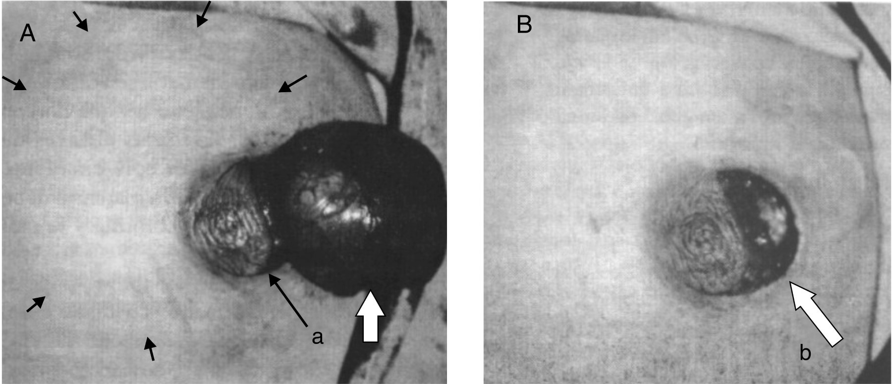 Tratamiento: incluye "resección quirúrgica selectiva" tanto en tratamiento como para confirmar el diagnóstico o la vigilancia cuidadosa de la evolución. La decisión de hacer una resección se basa en el tamaño de la lesión. Aunque algunos autores dicen que es posible hacer resecciones parciales bajo anestesia local, los autores prefieren que se realice bajo las medidas estrictas de un quirófano. El abordaje idóneo es subareolar (Figura 6A y B). Otro método bien establecido en mujeres adultas es el uso de agentes antigonadotrópicos y antiestrogénicos (Vg. danazol) en patologías con cambios fibroquísticos mamarios. El bloqueo del estímulo hormonal produce una regresión de la lesión.9