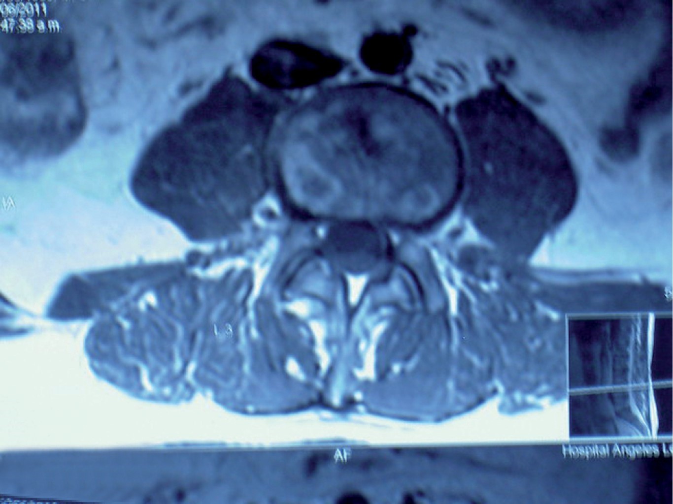 Los cambios tipo Modic son diferencias de señal en los platillos vertebrales detectados en la RMN; fueron descritos por Roos en 1987 y clasificados por Modic1 en 1988. Son hallazgos frecuentes y representan distintos estadios histológicos de la médula ósea subcondral (Tabla 1); se les considera parte de la enfermedad discal degenerativa. La prevalencia2 oscila entre 19 y 59%, siendo más frecuentes los tipos I y II. Su presencia se correlaciona con cambios bioquímicos en la degeneración discal, existiendo incremento de IL1A y MMP-3.3 Se originan por incremento en la carga con fuerzas de cizallamiento; el 67% de las ocasiones se localizan de L4 a S1, extendiéndose dentro del cuerpo vertebral abarcando todo el platillo; los localizados entre L1-L3 son generalmente pequeños, ubicados en la parte anterior del platillo; cuando se encuentran en L5-S1, principalmente los de tipo I, son asociados a dolor lumbar importante(Figuras 1, 2, 3 y 4).4 El diagnóstico diferencial debe realizarse con procesos infecciosos focales o espondilitis y, raramente, con metástasis.