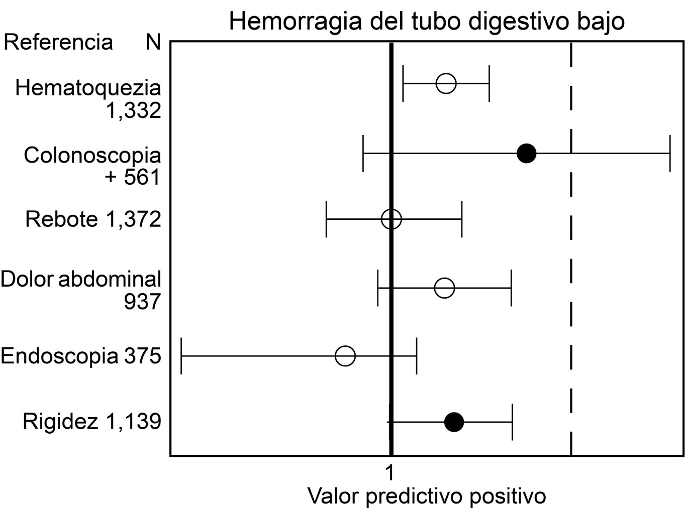 Cuando se presenta un paciente con el cuadro clínico de una HTDB, una serie de factores en relación con los antecedentes se deben considerar: la ingesta de aspirina o AINES, la aparición de enfermedad vascular, hemorragias anteriores, la terapia de radiación para el cáncer de próstata o de la pelvis, la aparición de sangre en las últimas dos semanas de colonoscopia o polipectomía, la infección por VIH, cirrosis hepática, coagulopatía (incluyendo la terapia de anticoagulación), y la indicación de cáncer colorrectal (antecedentes familiares, pérdida de peso, cambios en los hábitos intestinales).27 La duración de la hemorragia, la frecuencia de los episodios hemorrágicos y el color de las heces son de mayor importancia. La hematoquecia se describe como sangre de color rojo o marrón brillante por el recto y debe ser diferenciada de la melena, el paso de heces alquitranadas, cuya presencia es sugestiva de una fuente de HTDA (aunque el sangrado por el ciego y el colon del lado derecho ocasionalmente se presente en esta manera).28 Hasta un 11% de los pacientes con rectorragia masiva tiene HTDB. El paso de sangre de color rojo brillante que resulta de la HTDA se asocia con inestabilidad hemodinámica (shock o hipotensión ortostática).29 La presencia de sangre en los aspirados de una sonda nasogástrica es altamente predictiva de hemorragia proximal al ligamento de Treitz, pero esta fuente no puede excluirse si la sangre está ausente de lo aspirado.30 El tacto rectal debe ser realizado cuidadosamente para excluir una patología anorrectal y confirmar la descripción del paciente del color de las heces.31