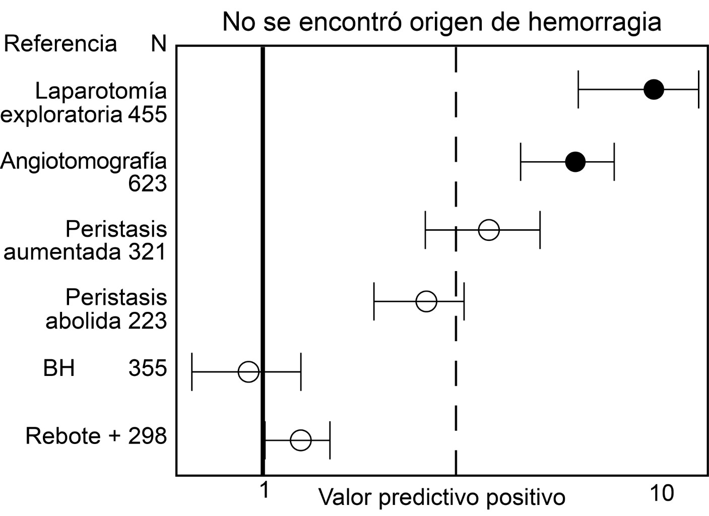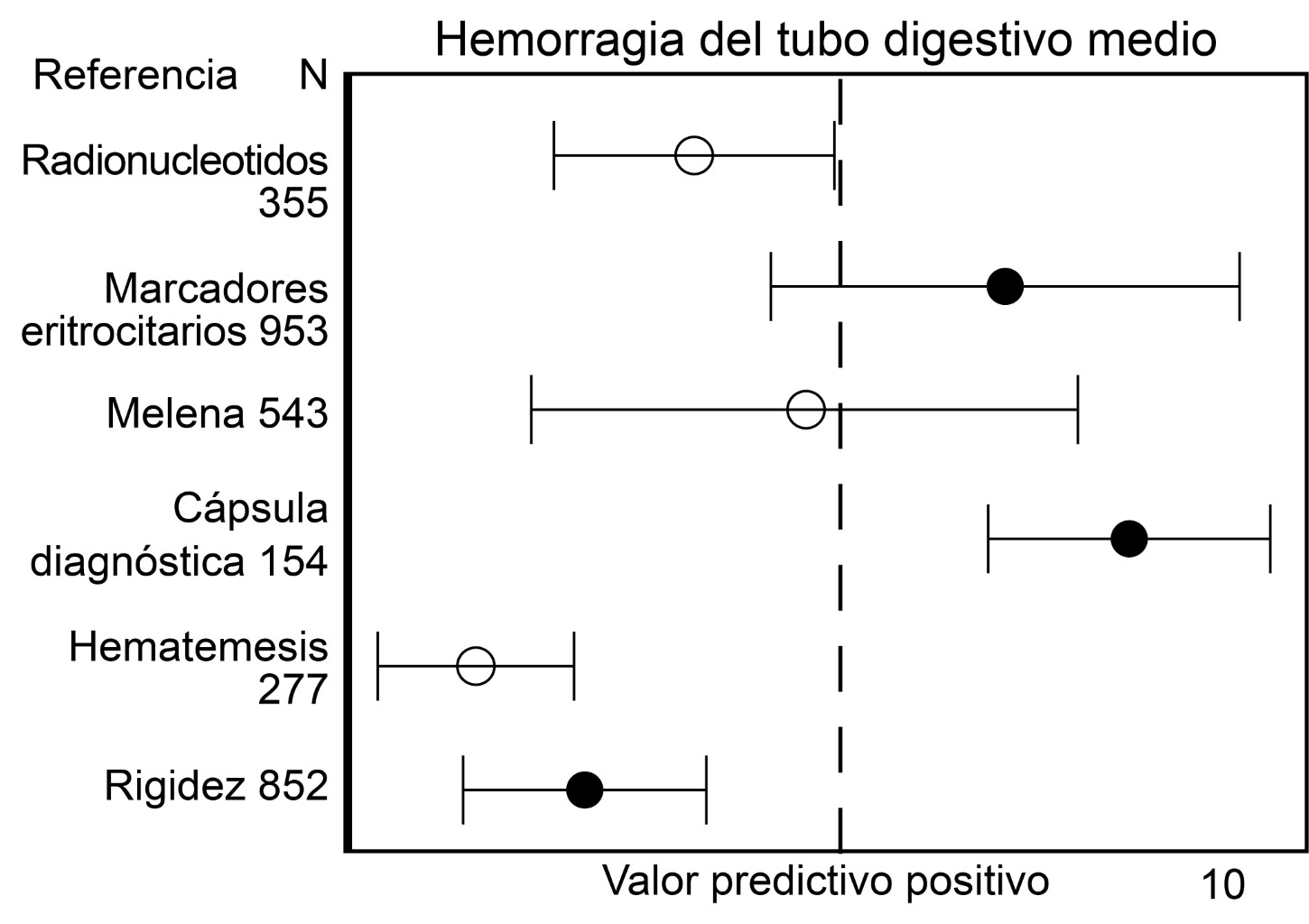 Para poder llegar al diagnóstico se tiene que realizar una serie de eventos consecutivos para identificar la causa del sangrado. Sin embargo, se tiene que realizar una semiología completa y métodos de resucitación del paciente antes de realizar estudios de gabinete. Posterior a la estabilización del paciente, hay modalidades no quirúrgicas utilizadas para el diagnóstico de HTDB como la colonoscopia, exploraciones con radionúclidos y la angiografía.18 Para poder identificar el origen de la hemorragia se tiene que realizar un protocolo sistematizado que fue el resultado del método de intervención diagnóstica con (p < 0.001) de nuestra muestra, n = 59 (Figura 2). Si el paciente presenta como signo clínico hematoquecia, se tiene que determinar si el paciente está estable hemodinámicamente o no; si no está estable, se tiene que intervenir siguiendo el protocolo del ATLS para la resucitación. Una vez estabilizado, se tiene que definir el área de la hemorragia del paciente, ya que la hematoquecia se puede presentar por un sangrado activo distal o HTDB o bien por HTDA o HTDM, con un sangrado > de 1,000 mL para presentarse como hematoquecia. El primer método de intervención diagnóstica sería colocar una sonda nasogástrica para aspiración del contenido gástrico VPP de 7.9 (7.3-8.5) (Figura 3). Si presenta hemorragia activa o contenido biliar, el siguiente paso sería confirmar el origen de la HTDA con una panendoscopia diagnóstica terapéutica VPP de 4.2 (1.1-6.3) (Figura 3). Si no presenta datos de hemorragia activa en la endoscopia, el siguiente paso diagnóstico sería realizar una colonoscopia VPP de 2.8 (0.8-8.6) (Figura 4). Si se detecta el sangrado, lo clasificaremos como una HTDB y se tendría que abordar la causa dependiendo de la gravedad del sangrado. Si no se detecta el origen de la hemorragia con la colonoscopia, se tiene que realizar un abordaje diagnóstico para HTDM (ángulo de Treitz-válvula ileocecal), lo que involucra marcadores eritrocitarios, radionucleótidos, cápsula diagnóstica con un VPP de 1.6 (1.0-2.5) (Figura 5). Si se detecta el origen de la hemorragia, se tiene que abordar para la estabilización del sangrado activo. Si la hemorragia del tubo digestivo no se pudo identificar con los estudios previos y/o está contraindicado realizar una colonoscopia, el paciente se tiene que intervenir con una angiotomografía diagnóstica/terapéutica con un VPP de 9.5 (16.3-22.4) (Figura 6). Por último, si no se encuentra el origen de la hemorragia del tubo digestivo alto, medio o bajo después de todo el protocolo de abordaje, es candidato a una exploración por laparotomía y tratar la causa de origen quirúrgicamente con un VPP de 6.3 (9.3-12.3) (Figura 6). La colonoscopia es el método de diagnóstico inicial de elección en la mayoría de los pacientes que están hemodinámicamente estables. En pacientes hemodinámicamente inestables y en aquéllos con HTDB leve, se puede realizar una angiografía. La angiografía también se realiza si la colonoscopia no ha logrado identificar un sitio de sangrado.19