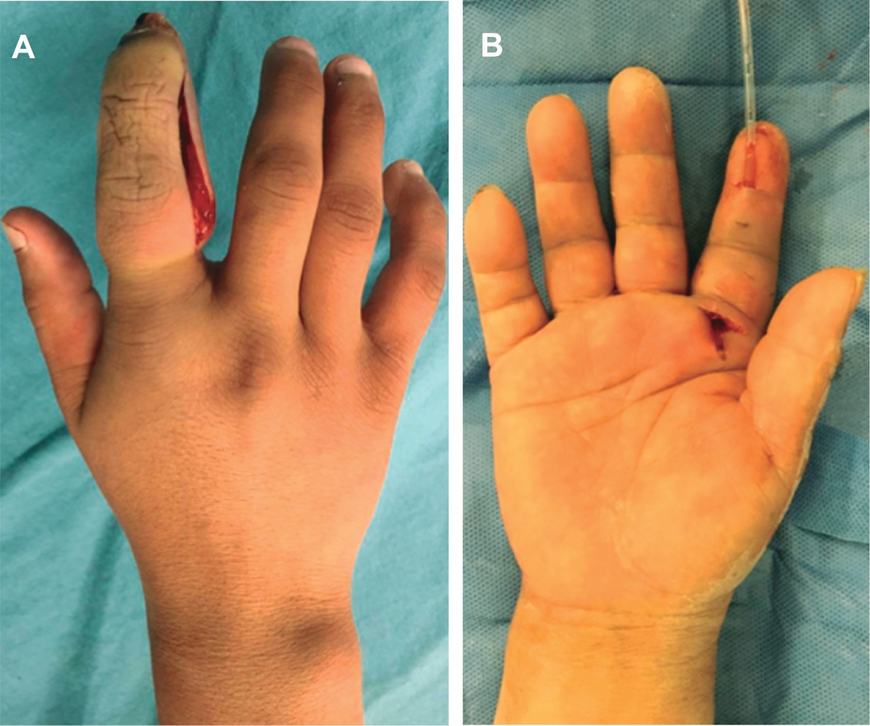 La intervención quirúrgica es necesaria en la mayoría de los casos, la cual consiste en realizar un abordaje para exposición distal y proximal de la vaina tendinosa y su irrigación, con un abordaje con incisión medio-lateral en el dedo infectado o una incisión transversal distal, inmediatamente proximal al pliegue de la articulación interfalángica distal, haciendo la apertura de la vaina tendinosa a ese nivel y posteriormente una segunda incisión transversal en la región distal, proximal a la polea A1, con posterior colocación de la sonda de irrigación (Figura 4).13,14