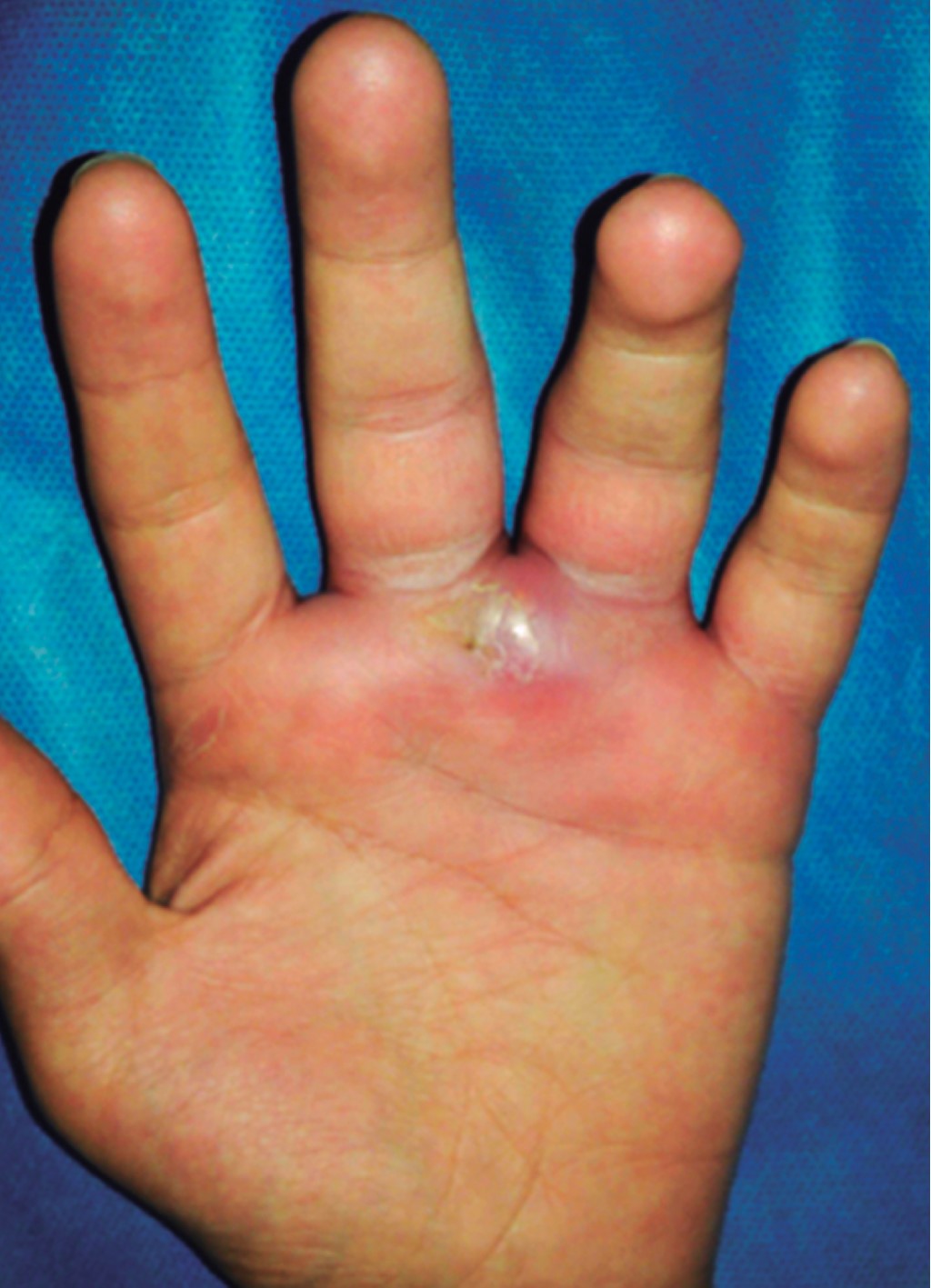 Las infecciones en dorso de la mano son reconocidas fácilmente por la presencia del cuadro clínico, el cual comprende dolor, calor, rubor y edema.4,6 El tratamiento se basa en la elevación del miembro, inmovilización, antibioticoterapia y drenaje quirúrgico, el cual debe llevarse a cabo en el sitio de mayor fluctuación o aumento de volumen.3,6