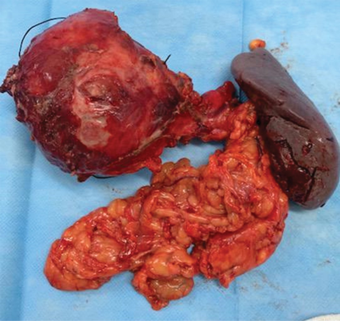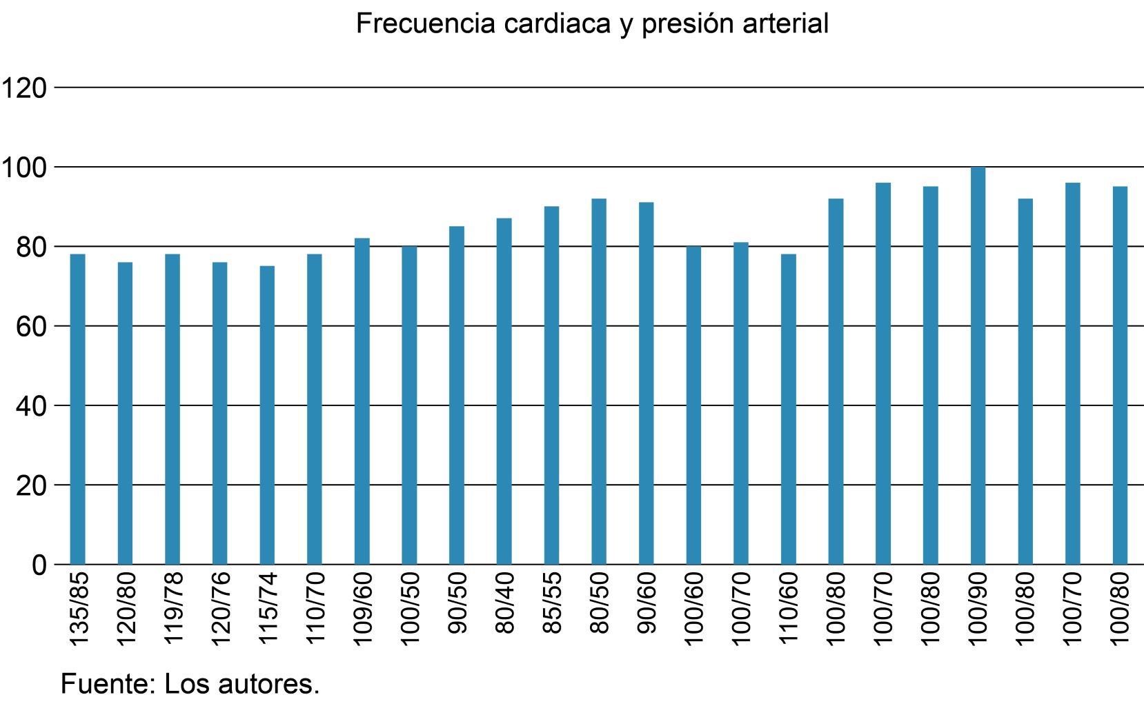 Se programa como la primera cirugía del turno. Previo a ingresar a quirófano, se premedica con hidrocortisona 100 mg IV, difenhidramina 30 mg IV y ranitidina 50 mg IV. Ingresa a sala de quirófano, consciente, neurológicamente íntegra, con signos iniciales: TA 135/80, TAM 103 mmHg, FC 85 lpm, SpO2 90%, FR 12 rpm. Se administra ansiólisis con midazolam 2 mg IV, se realizó inducción anestésica con fentanilo 200 μg IV, propofol 150 mg IV, cisatracurio 10 mg IV. Previa preoxigenación con mascara facial a 5 lpm y latencia farmacológica, se orointuba con sonda orotraqueal No 7.5 al primer intento sin complicaciones, y se conecta a ventilador mecánico en modo controlado por volumen. Se toma línea arterial radial izquierda. El mantenimiento con infusión de fentanilo a 3 μg/kg/hora, sevoflurano 1.5 a 2 vol. %, en adecuado plano anestésico. Una vez realizada la resección (Figura 1), transcurridas tres horas de cirugía, se procedió al cierre y colocación de drenajes. La paciente presenta desaturación gradual llegando a 60%, además de hipotensión hasta 50/20 mmHg con TAM de 30 mmHg. Se inició reanimación hídrica con cristaloides y coloides sin respuesta adecuada, por lo que se administraron 2 gramos de gluconato de calcio IV. Se presentó además broncoespasmo severo, por lo que se inició ventilación manual a presión positiva y se administraron cuatro disparos de salbutamol por cánula orotraqueal. Al no mejorar la hipotensión, se suspendió la infusión de fentanilo, se procedió a verificar posibles sitios de sangrado sin hallarse, se decidió iniciar infusión de noradrenalina a 0.03 μg/kg/min. Del mismo modo, el broncoespasmo no presentaba mejoría por lo que se administraron tres disparos de bromuro de ipratropio/salbutamol por cánula orotraqueal y 250 mg de aminofilina IV, incluso se administra adrenalina, dosis de 80 μg a través del tubo orotraqueal, con lo que finalmente se logró reversión. Se evidencia en cavidad abdominal sonda de Penrose (único contacto con látex durante todo el procedimiento), se procede a su retiro. Se aplican 0.7 μg de adrenalina IM, y se inicia infusión de ésta a 0.03 μg/kg/min, se aumentó infusión de noradrenalina de forma gradual hasta una dosis máxima de 0.10 μg/kg/min con lo que mejora la tensión arterial. Termina procedimiento quirúrgico. La paciente se traslada a unidad de terapia intensiva con TA de 100/70 mmHg, TAM 80 mmHg, SpO2 95%, FC 95 lpm (Figura 2) en ventilación asistida, con infusión de fentanilo a 1 μg/kg/h, noradrenalina a 0.5 μg/kg/min y adrenalina a 0.03 μg/kg/min. En la unidad de terapia intensiva mantiene adecuada evolución posquirúrgica logrando su alta hospitalaria a los 20 días postquirúrgicos.