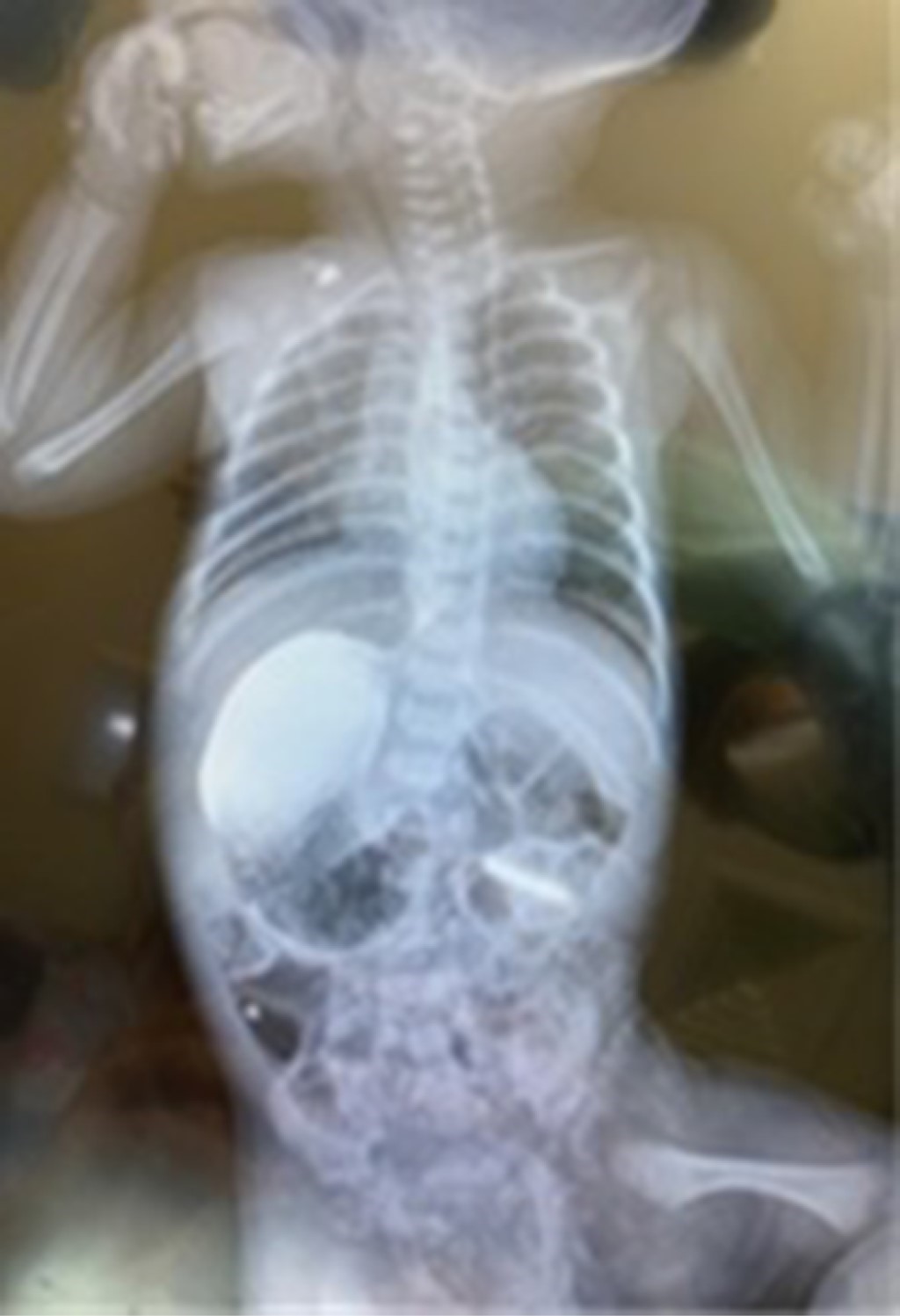 Acudió a los 16 días de vida por vómitos de contenido alimenticio postprandial; la madre lo refirió con avidez alimenticia. Dado que se observó con mucosas subhidratadas, se ingresó con diagnóstico de intolerancia a la vía oral para descartar enfermedad de Hirschsprung o hipertrofia congénita del píloro. Durante su evolución se mantuvo con distención abdominal, persistencia de vómito de contenido biliar; en varias ocasiones se intentó el reinicio de la vía oral sin éxito, se colocó sonda que obtuvo gasto biliar.
